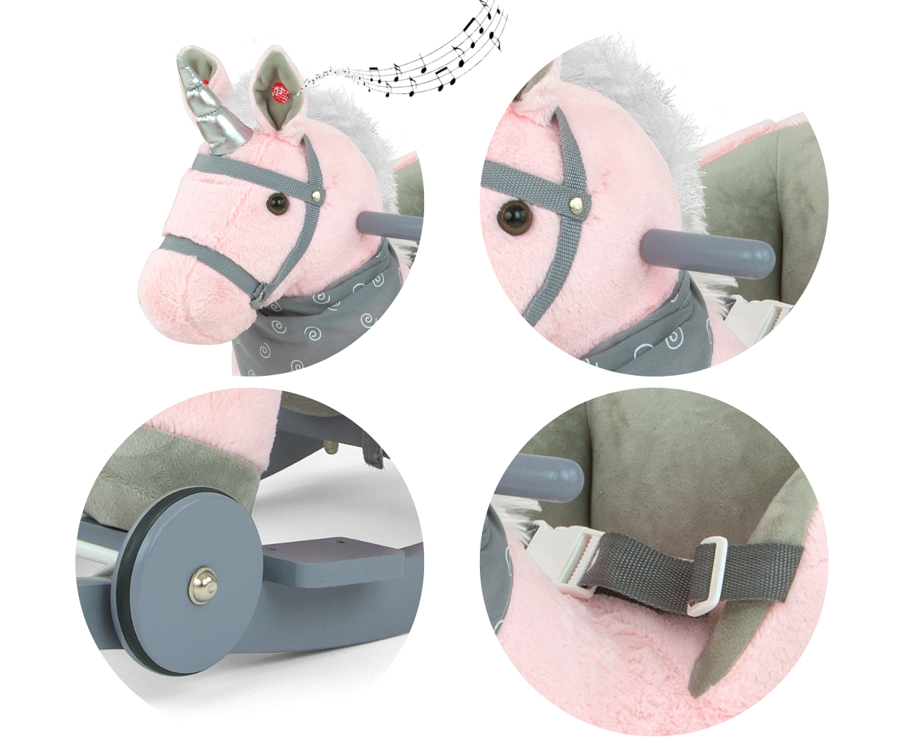 Igračka je opremljena drvenim ručkama i ljuljačkama s osloncima za noge, koje malom jahaču pomažu u održavanju ravnoteže u igri. Set sklopivih kotača može se jednostavno promijeniti u položaj kako bi se klackalice pretvorile u prekrasnu plišanu vožnju.