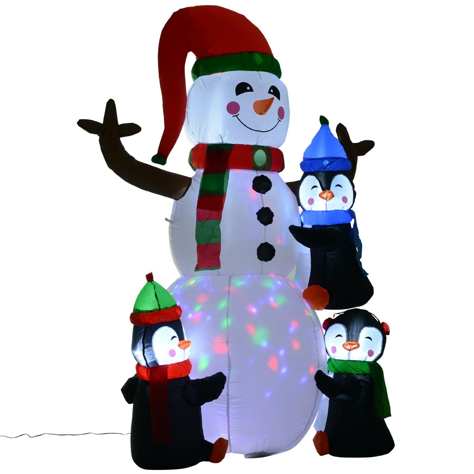 Snjegović na napuhavanje visine 180 cm s LED osvjetljenjem, donosi veseli i blagdanski ugođaj u vaš dom ili dvorište. Ovaj simpatični snjegović nosi crvenu kapu i šareni šal, a oko njega su tri preslatka pingvina, svaki odjeven u vlastite blagdanske kape i šalove. Kombinacija veselih izraza i blagdanskog duha čini ovu dekoraciju idealnim dodatkom za božićno uređenje.