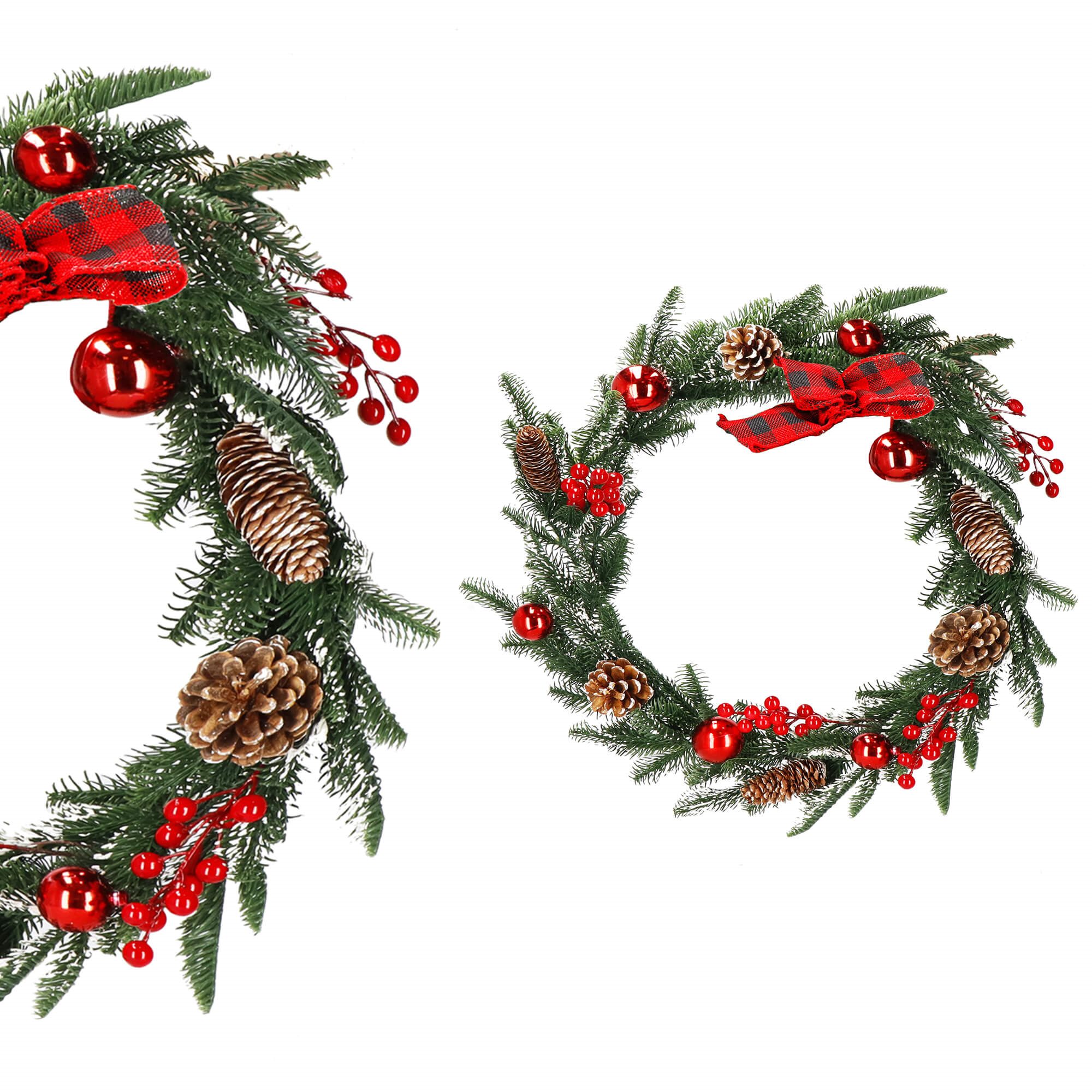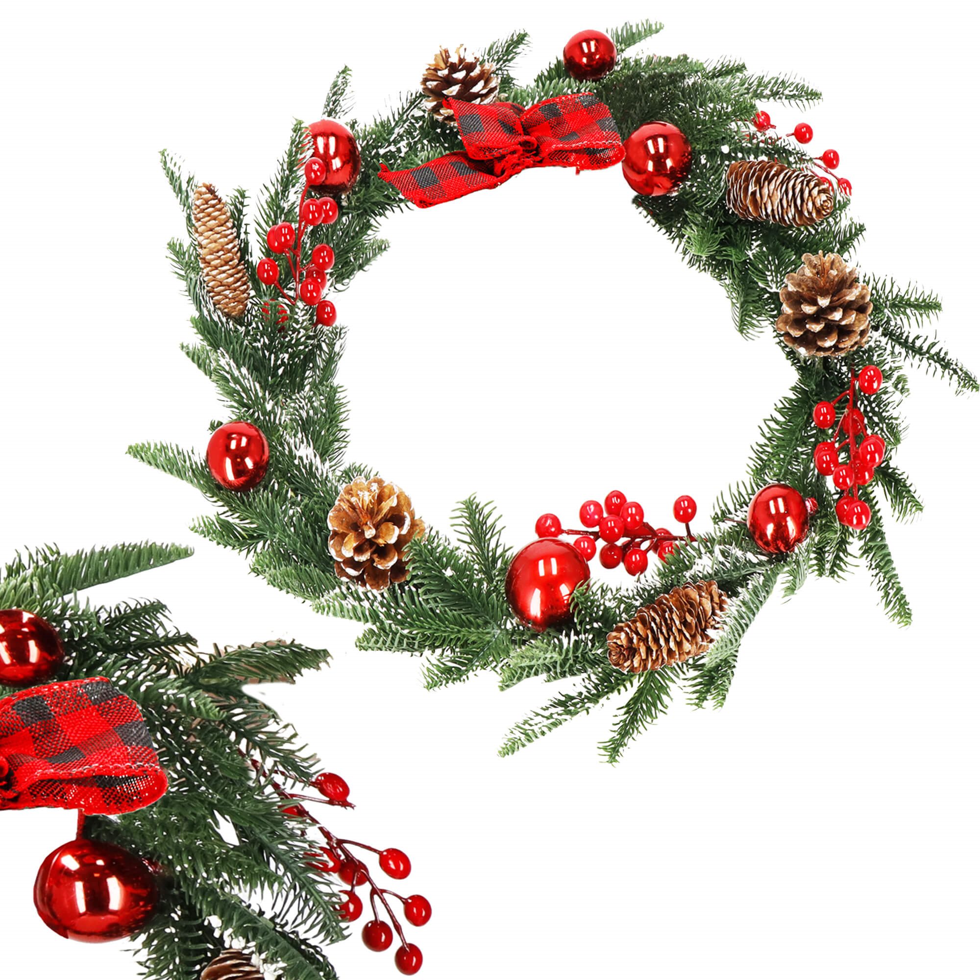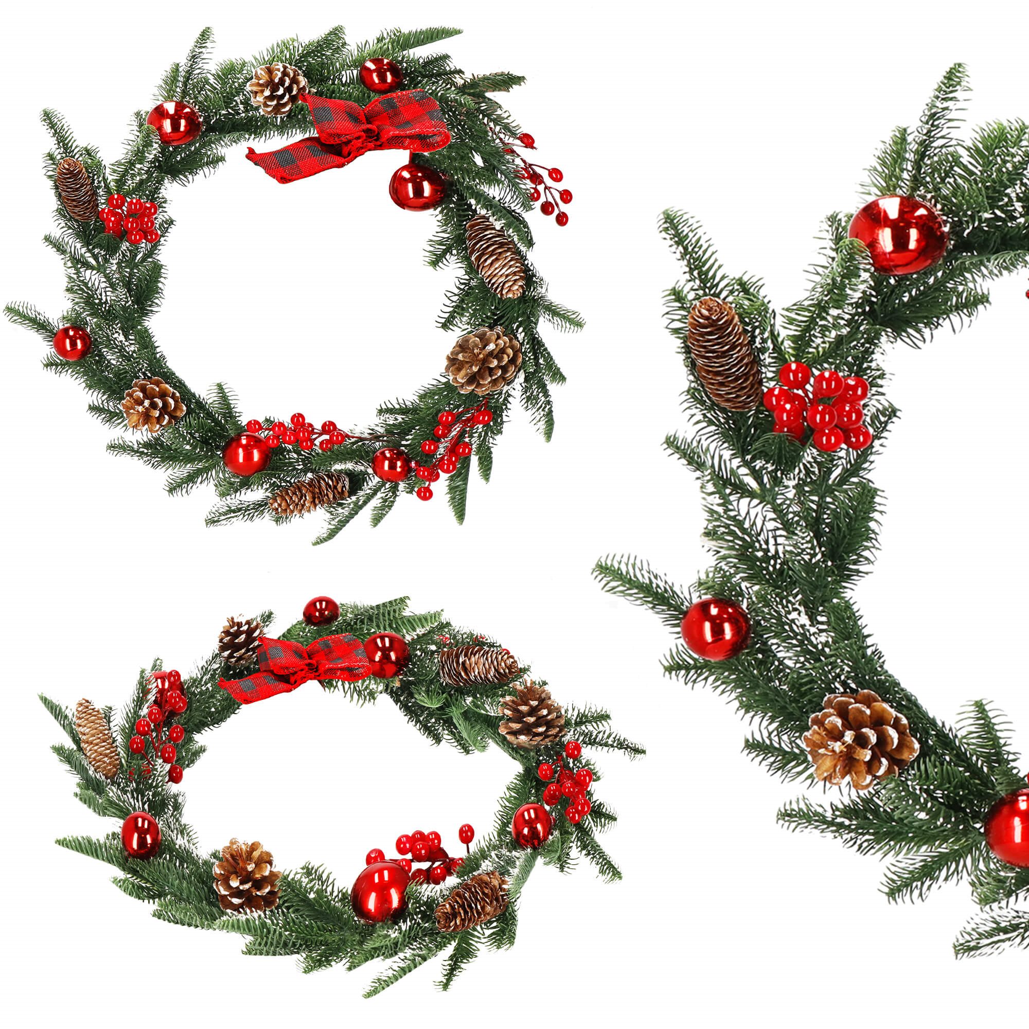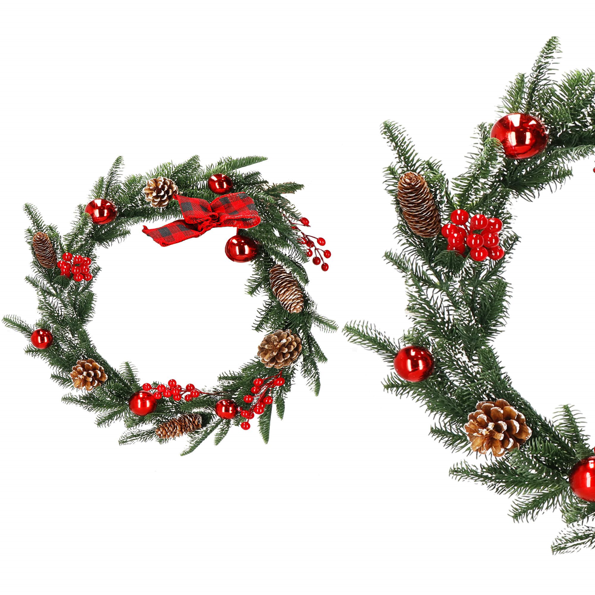 Dizajn: vijenac ukrašen češerima, grančicama jarebike i crvenim kuglicama; karirana mašna na jednom kraju