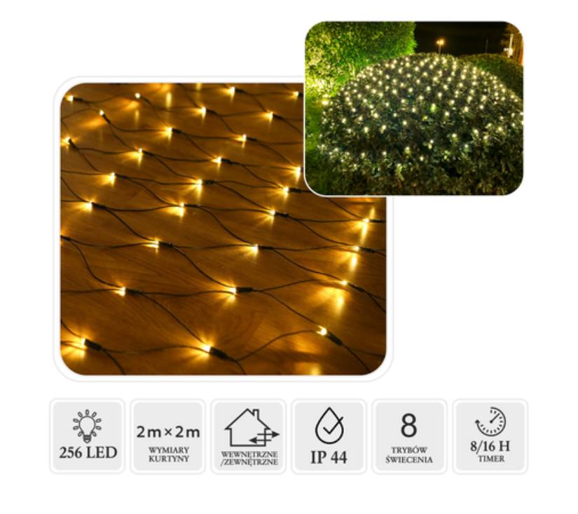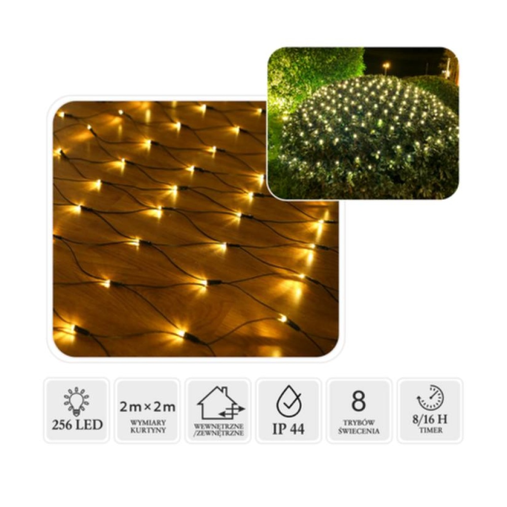 Svjetlosna zavjesa za stvaranje atmosfere u obliku mreže dimenzija 2 × 2 m, opremljena s 256 toplo bijelih LED dioda. Stvara ugodan, ravnomjeran svjetlosni efekt koji savršeno ističe blagdansku atmosferu – i u zatvorenom i na otvorenom. Zahvaljujući IP44 klasi zaštite, zavjesa je prikladna za fasade, balkone, ograde ili vrtne aranžmane. Ima programator s 8 funkcija s memorijskim postavkama i timerom od 8/16 sati, pružajući udobnost i fleksibilnost u uređenju.