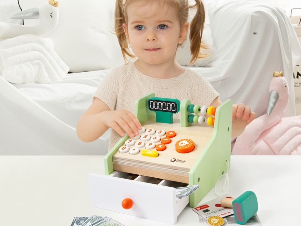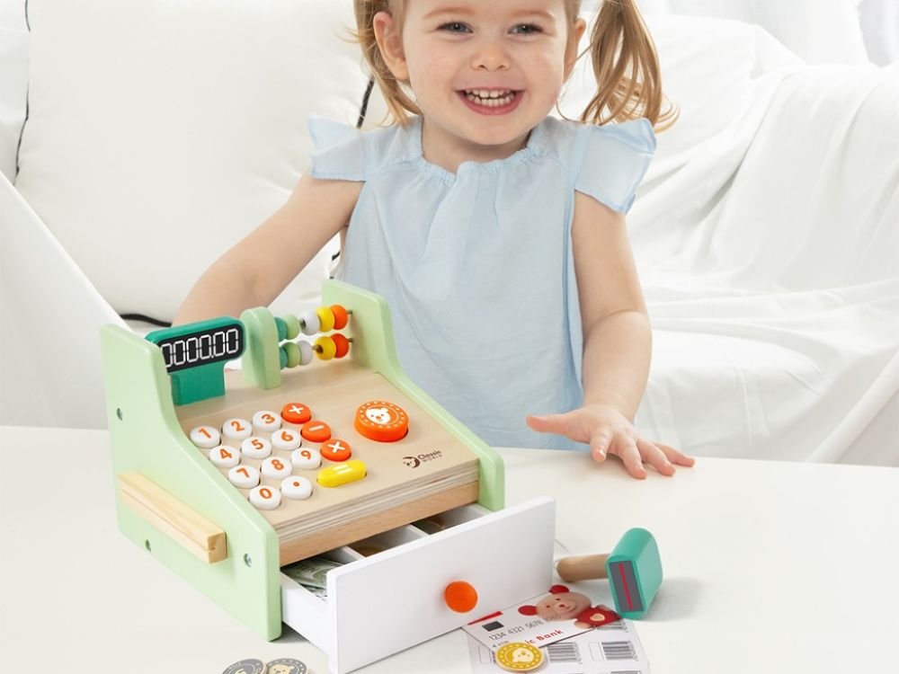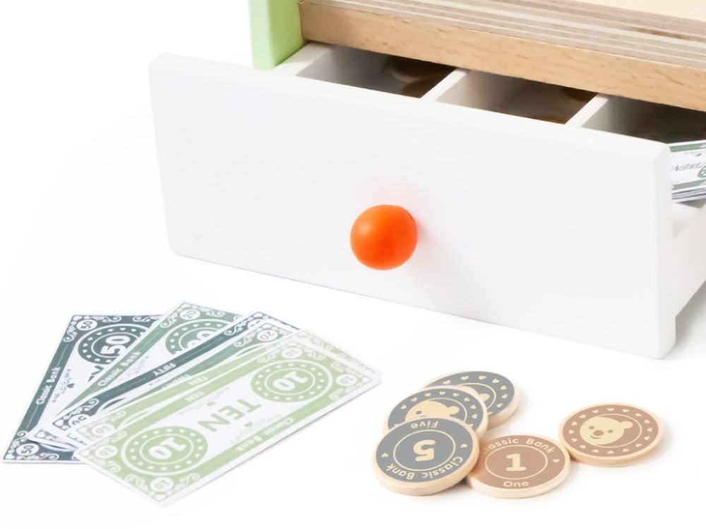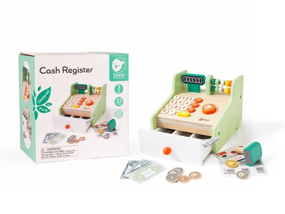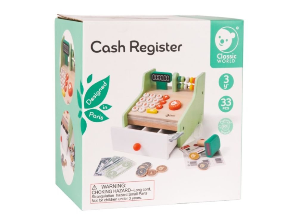 Blagajna trgovine Classic World izvrsna je drvena igračka koja će vam omogućiti da igrate mnoge scene koje se mogu dogoditi u trgovini. Djeca mogu preuzeti ulogu blagajnika ili kupca te zajedno vježbati društvene interakcije i svoje komunikacijske vještine. Gotovina ili kartica? Izračunajte dospjeli iznos, prihvatite novac i pravilno dajte kusur. Blagajna sadrži novčanice, kovanice i platnu karticu. Vaše dijete može učiti dok se zabavlja! Kraljica znanosti – matematika više neće biti strašna.