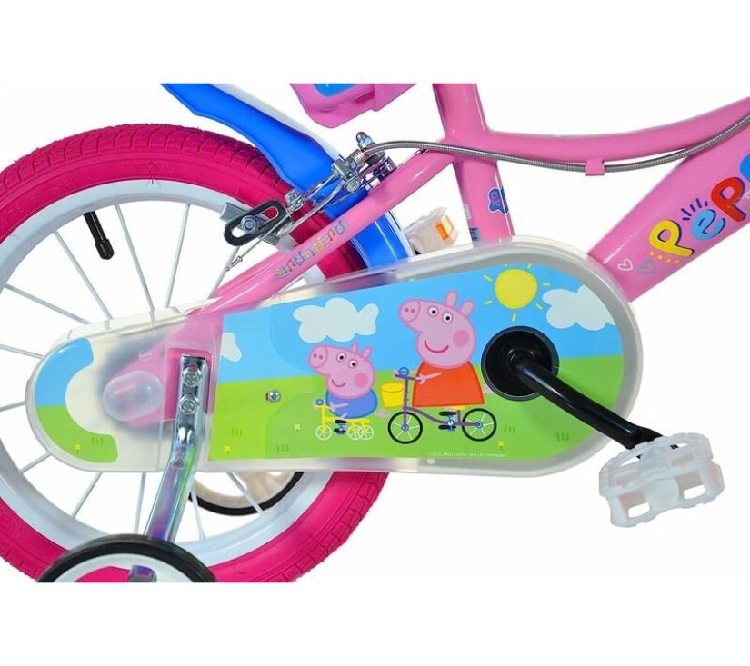 Dječji bicikl Peppa Pig 16″. Poseban za svaku djevojčicu koja voli Peppa Pig. Dječji bicikl Peppa Pig 16″ idealan je prvi bicikl. Bicikl može rasti sa sposobnošću vašeg djeteta, jer ima uklonjive pomoćne kotače sa šarenim uzorkom. Uz mnoge značajke kao što su blatobrani, potpuno zatvorena zaštita od lanca, podesiv upravljač, jak stražnji nosač i košarica. Bicikl ima prednju ručnu i stražnju nožnu kočnicu.