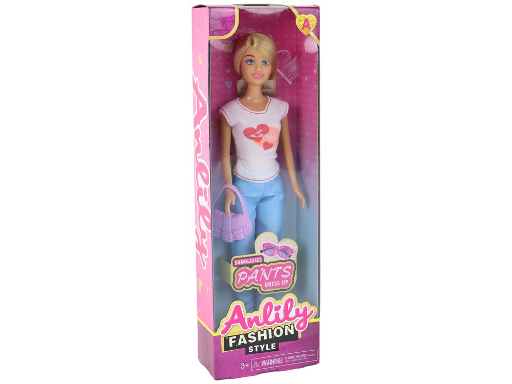 Ova lutka je dimenzija 30 cm x 7 cm x 5 cm i prava je modna ikona.Lutka je odjevena u bijelu bluzu sa srcima, plave hlače i bijele sportske cipele, što joj daje moderan izgled. Ali tu nije kraj! U kompletu se nalazi i ljubičasta torbica te ružičaste naočale koje omogućuju još kreativniju zabavu i styling.Lutka Anlily ima dugu plavu kosu i plave oči koje joj daju izuzetan šarm. Možete ga češljati, ukrašavati i stvarati različite frizure, koje će kod vašeg djeteta razvijati kreativnost.Dimenzije paketa su 32 cm x 11 cm x 5 cm. Savršen je dar za djecu koja vole modu i kreativnu zabavu. Lutka Anlily je suputnik u avanturi i prijatelj s kojim se možete igrati. Neka vaše dijete razvije svoju maštu, uživa u trenucima punim stila i šarma i stvara vlastite priče s ovom preslatkom lutkom.