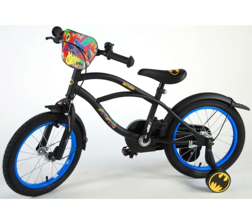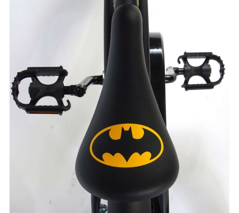 Sigurnost je na prvom mjestu! Zato ovaj cool bicikl ima ručnu kočnicu, nožnu kočnicu te zatvoreno kućište lanca. Osim toga, bicikl ima odvojive pomoćne kotače za brzo učenje vožnje, zvono i katadioptere (mačje oči) u pedalama. Mislilo se i na udobnost. Prekrasan crni Batman bicikl s plavim detaljima ima iznimno dugačke blatobrane koji zaustavljaju svu prljavštinu, ugodno mekano sjedalo i jedinstven okvir koji može izdržati udarce. Kako biste što duže uživali u biciklu, sjedalo i upravljač su podesivi po visini.
