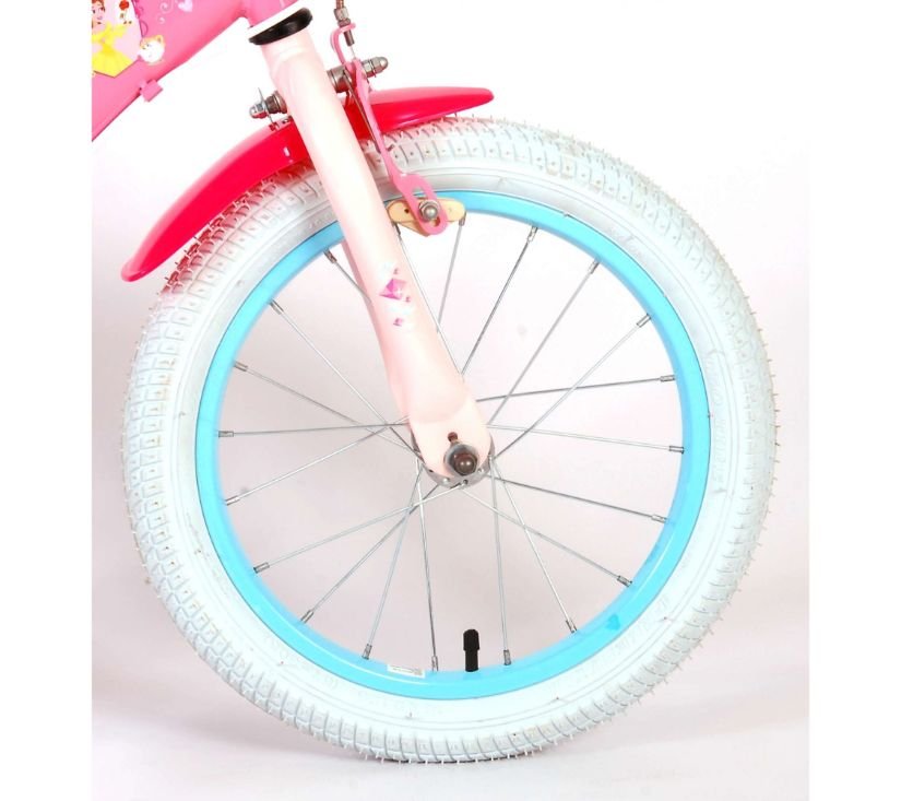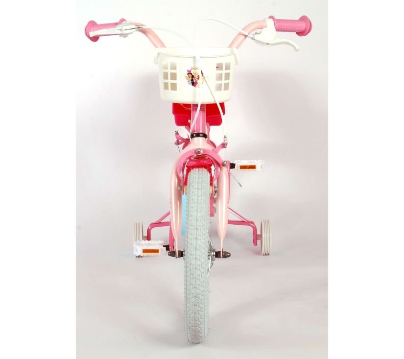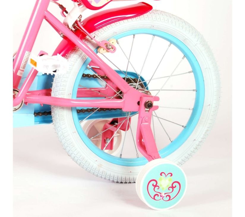 Sigurnost je na prvom mjestu! Zato ovaj cool bicikl ima dvije ručne kočnice i zatvoreni štitnik lanca. Osim toga, bicikl ima uklonjive pomoćne kotače za brzo učenje vožnje. Mislilo se i na udobnost. Lijepi ružičasti Princess bicikl s plavim detaljima ima otisnuto meko sjedalo, sjedalo za lutku ispod sjedala i košaru za nošenje svih vaših sitnica. Kako biste što duže uživali u biciklu, sjedalo i upravljač su podesivi po visini. Ukratko: bicikl vrhunske kvalitete po super cijeni!