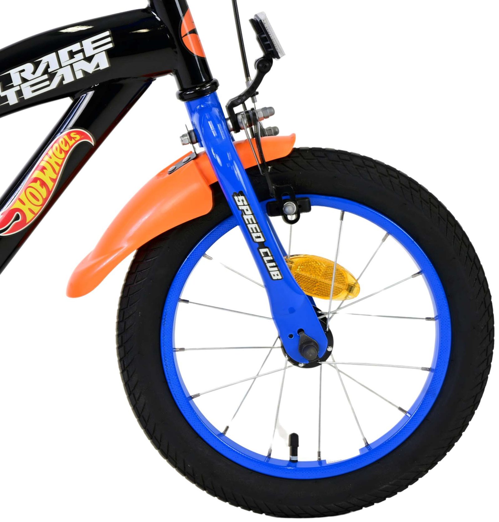 Sigurnost je na prvom mjestu! Stoga, ovaj cool bicikl ima ručnu kočnicu i kočnicu za usporenje i zatvoreni kućište lanca. Osim toga, bicikl ima uklonjive kotače za vježbanje za brzo učenje vožnje bicikla i reflektore u pedalama. Mislilo se i na udobnost. Prekrasan crni Hot Wheels bicikl s plavim i narančastim detaljima ima ugodno meko sjedalo i jedinstveni okvir koji može izdržati. Kako biste što duže uživali u biciklu, sjedalo je podesivo po visini. Ukratko: vrhunski bicikl u kojem vaše dijete može uživati godinama!