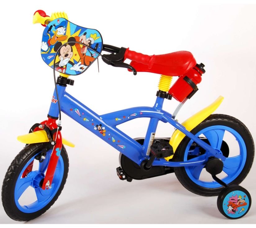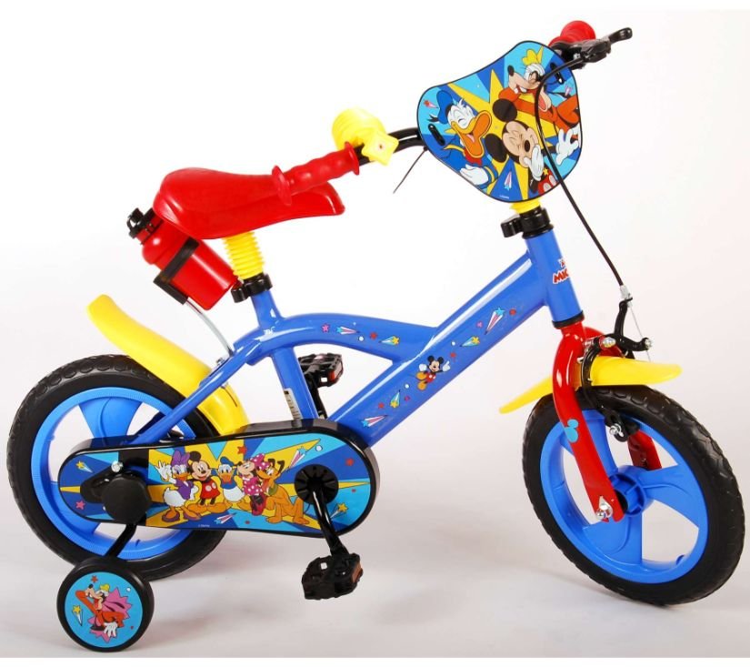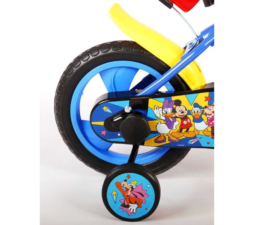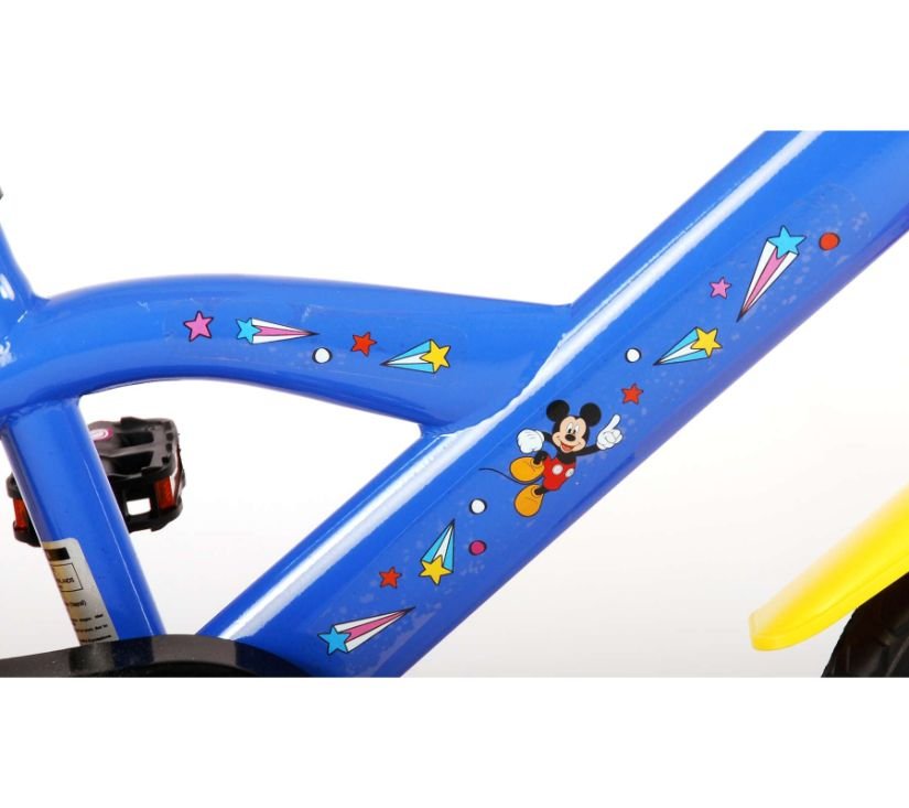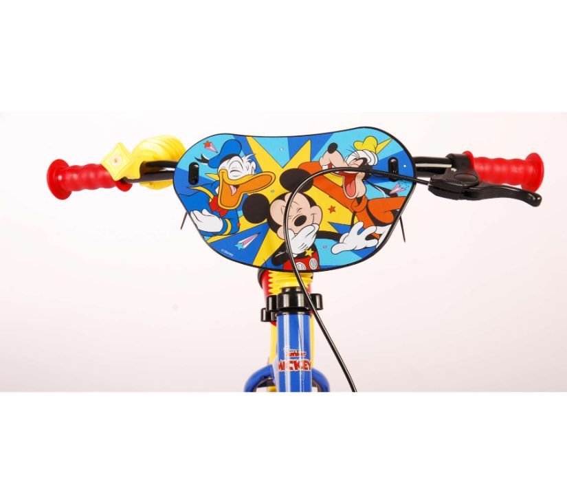Sigurnost je na prvom mjestu! Zato ovaj cool bicikl ima sustav pedaliranja koji djetetu omogućuje vožnju naprijed i natrag, ručnu kočnicu na prednjem kotaču i uklonjive pomoćne kotače za brzo učenje vožnje. Osim toga, bicikl ima zabavnu trubu i zatvoreni štitnik lanca. Prekrasan plavi Mickey Mouse bicikl s crvenim detaljima ima snažne gume od EVA pjene za ugodnu vožnju i bocu za vodu u držaču ispod sjedala. Kako biste što duže uživali u biciklu, sjedalo i upravljač su podesivi po visini.