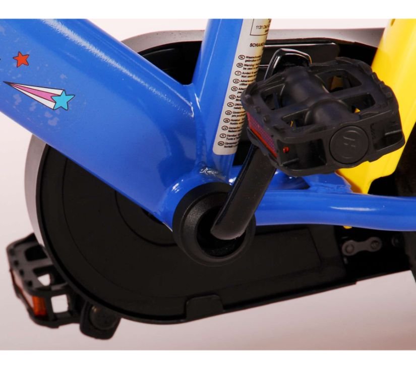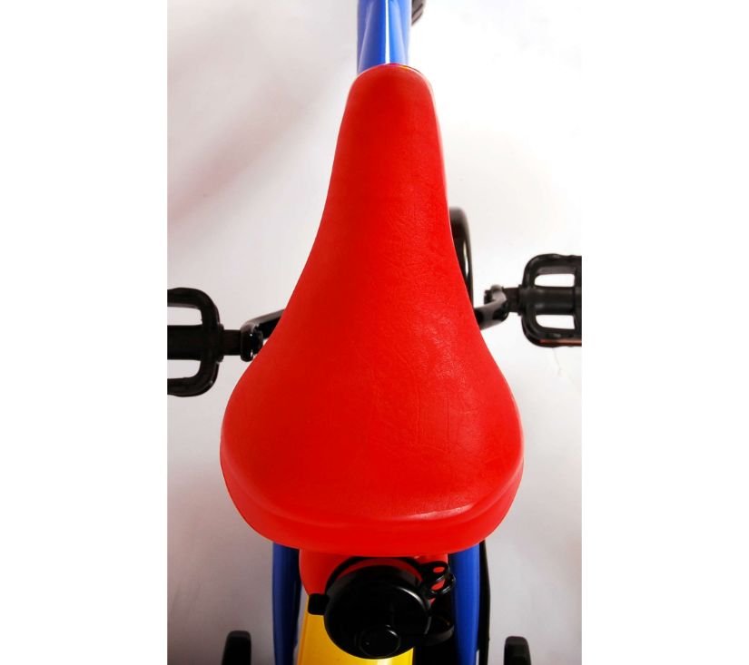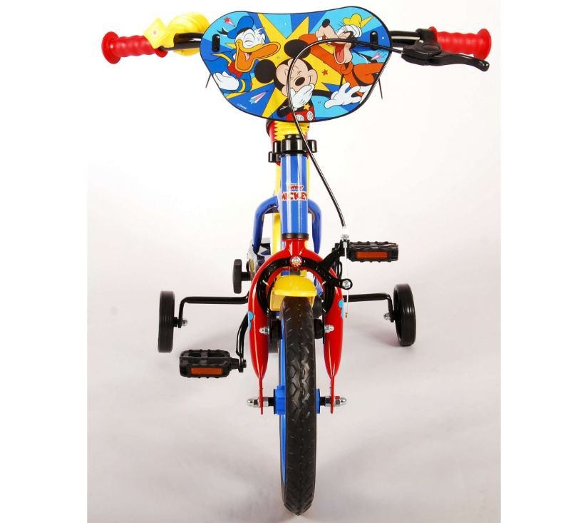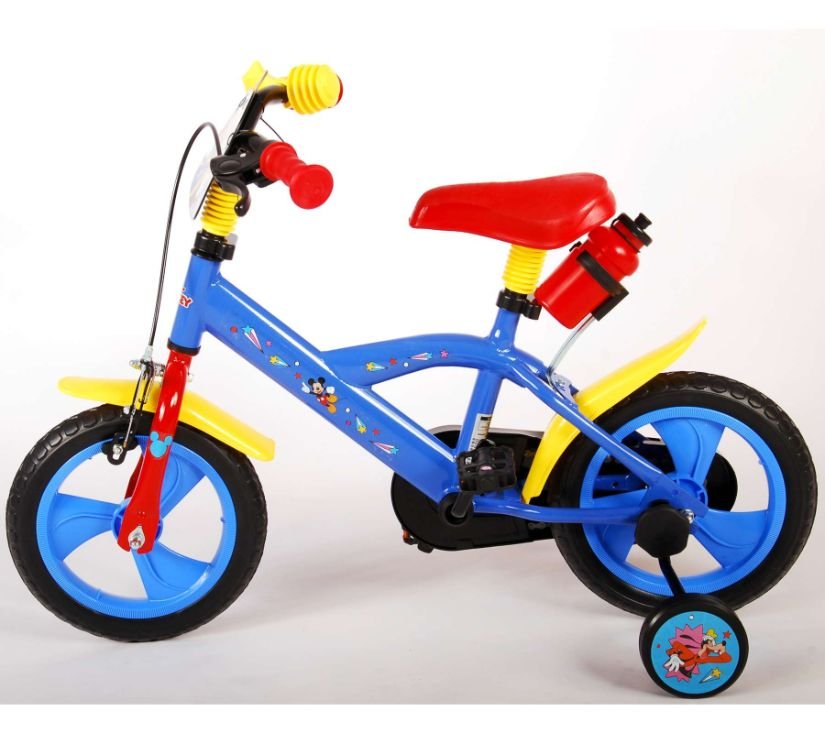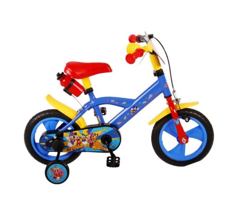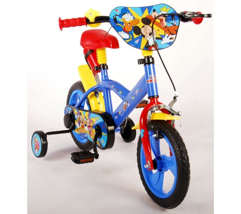 Sigurnost je na prvom mjestu! Zato ovaj cool bicikl ima sustav pedaliranja koji djetetu omogućuje vožnju naprijed i natrag, ručnu kočnicu na prednjem kotaču i uklonjive pomoćne kotače za brzo učenje vožnje. Osim toga, bicikl ima zabavnu trubu i zatvoreni štitnik lanca. Prekrasan plavi Mickey Mouse bicikl s crvenim detaljima ima snažne gume od EVA pjene za ugodnu vožnju i bocu za vodu u držaču ispod sjedala. Kako biste što duže uživali u biciklu, sjedalo i upravljač su podesivi po visini.