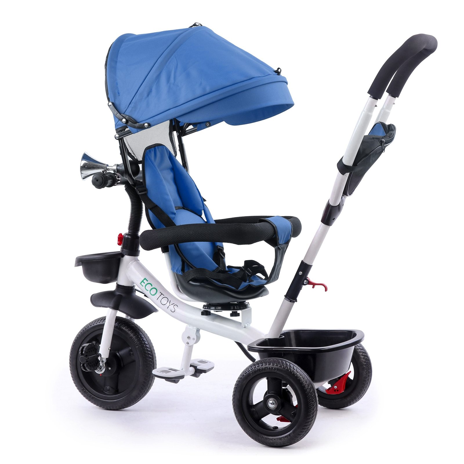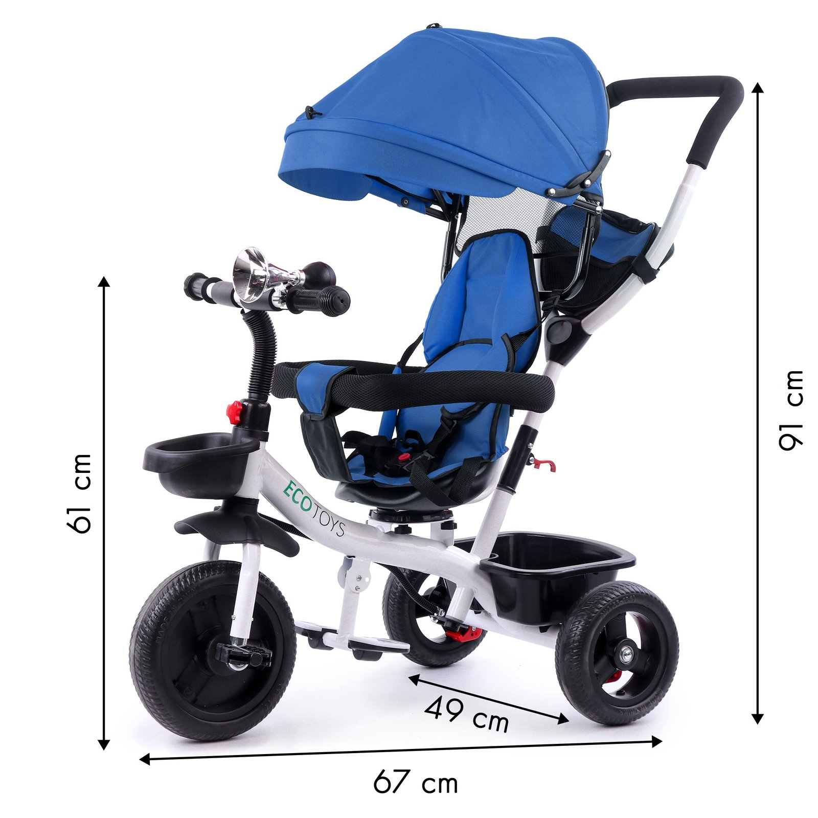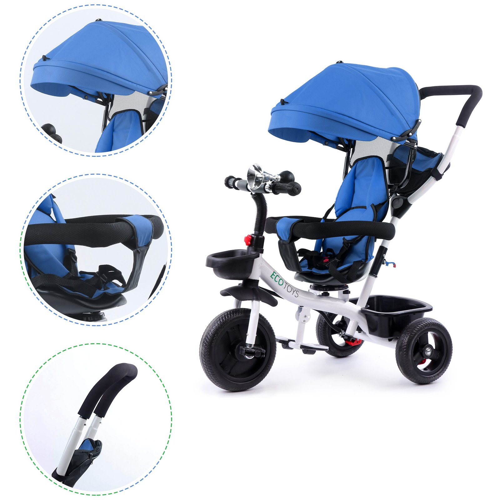 ECOTOYS bicikl kombinira mnoga praktična rješenja koja će vašem djetetu pružiti udobnu i sigurnu igru . Bicikl ima mekan, udoban naslon zahvaljujući kojem će mališan sjediti udobno, a pojasevi i ogradice će ga zaštititi od ispadanja sa sjedala. Sklopivi baldahin će štititi od kiše i sunca . Posebno profilirani okvir i okretno sjedalo olakšat će ulazak najmlađoj djeci.