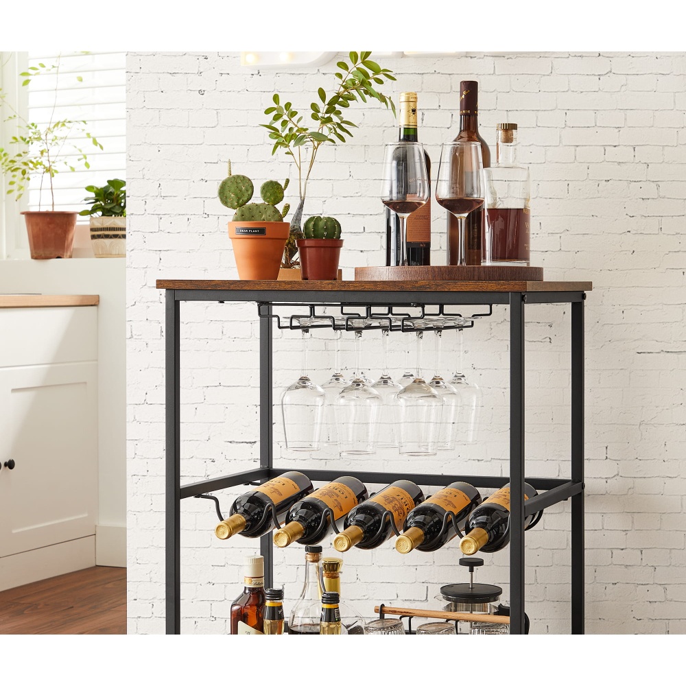 Barski stol izrađen u rustikalni stil, tj. prikladno stiliziran da izgleda staro. Opremljen je okretnim kotačima s kočnicama (dva imaju kočnice) koji olakšavaju pomicanje.