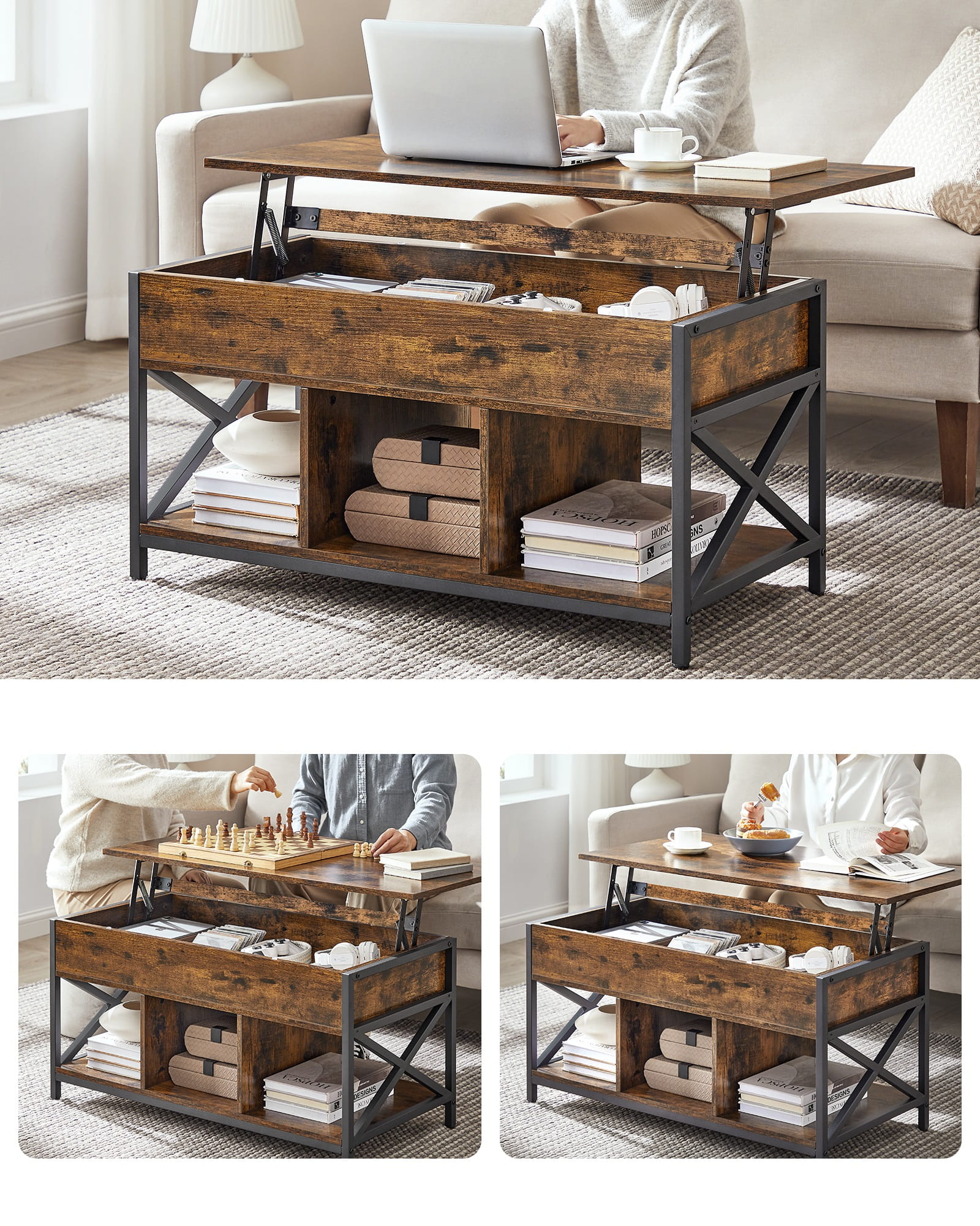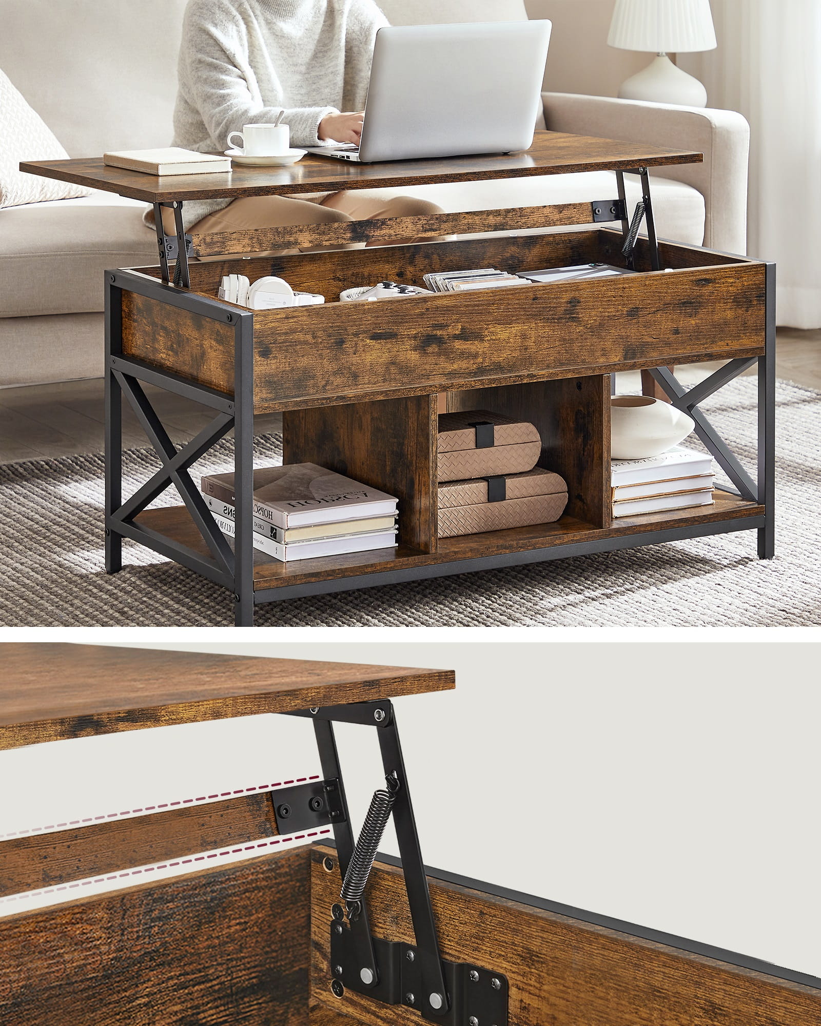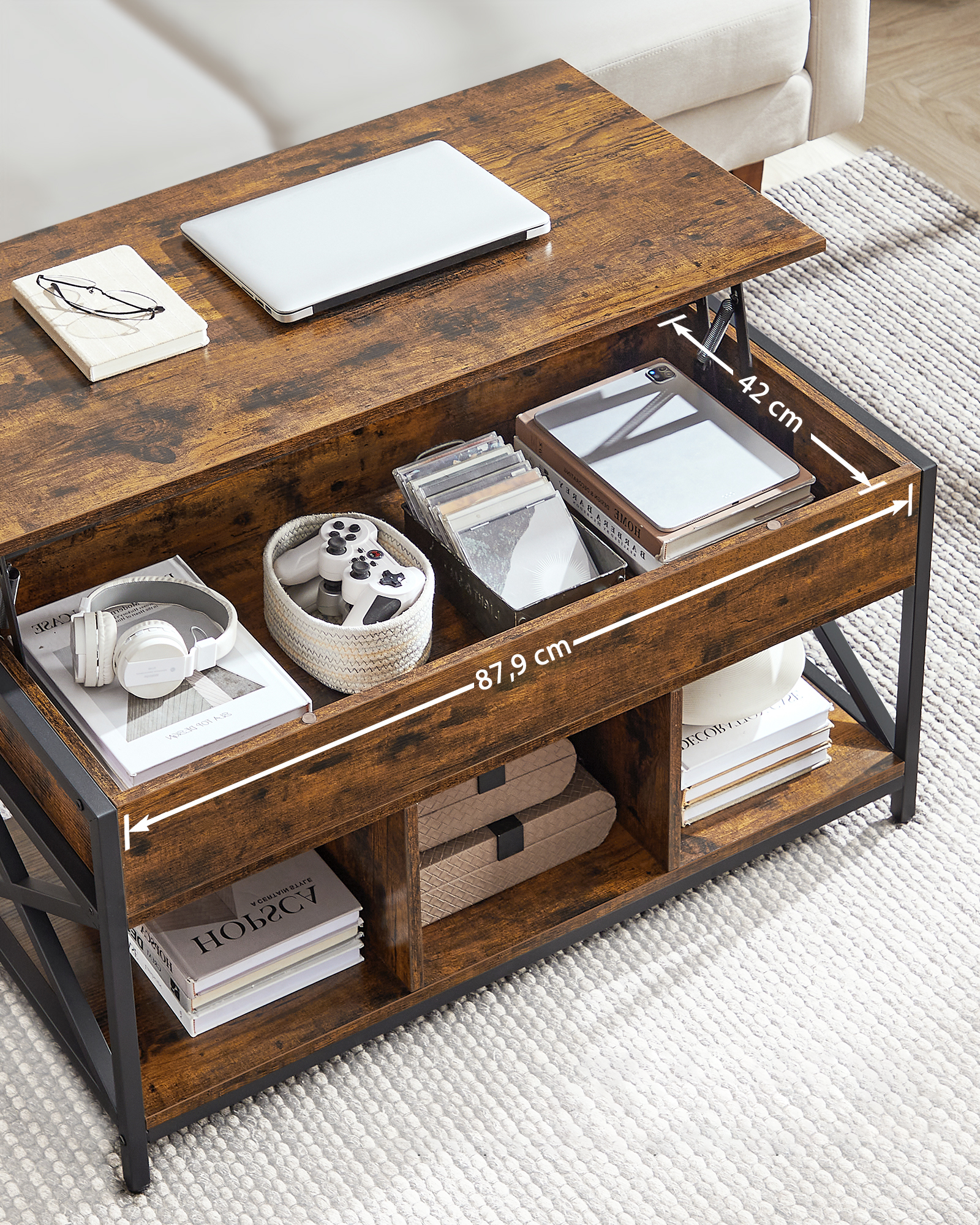 Stol izrađen u rustikalnom stilu, tj. primjereno stiliziran da izgleda staro. Odgovarajuće dimenzije stola pružaju dovoljno mjesta za šalice za kavu, prijenosno računalo, daljinski upravljač za TV i pladanj s grickalicama.