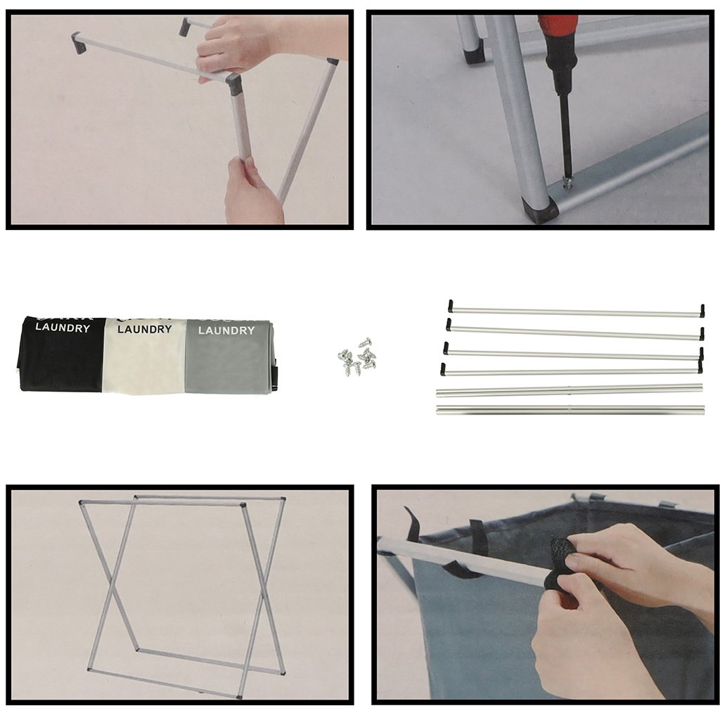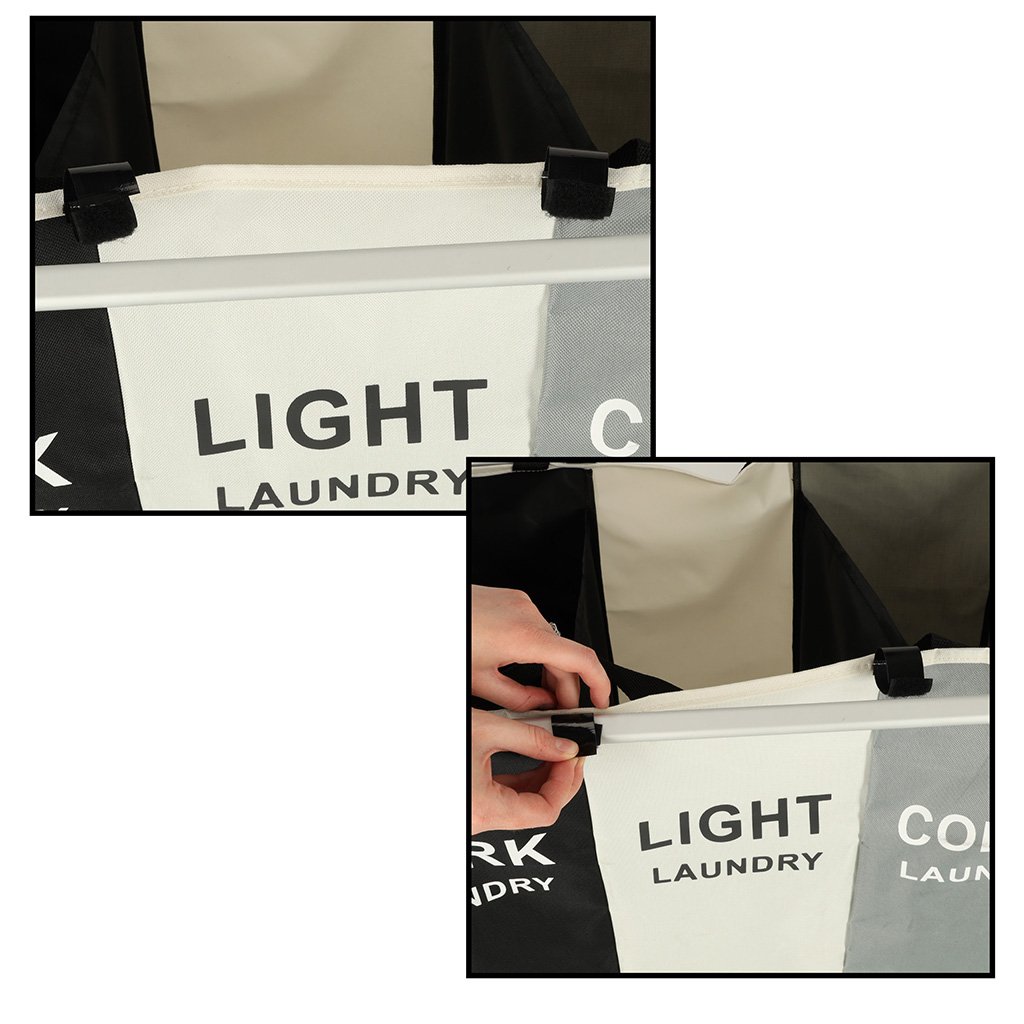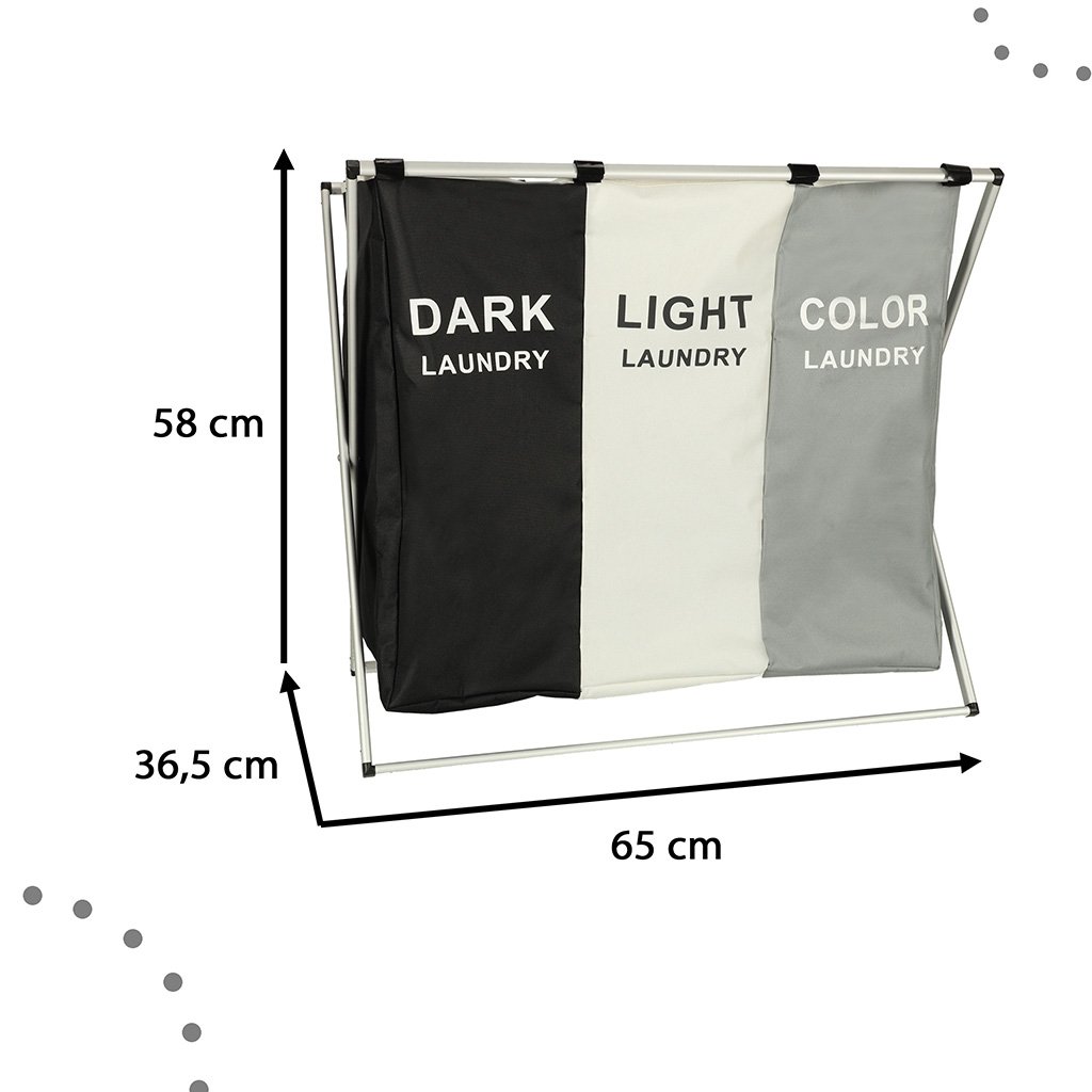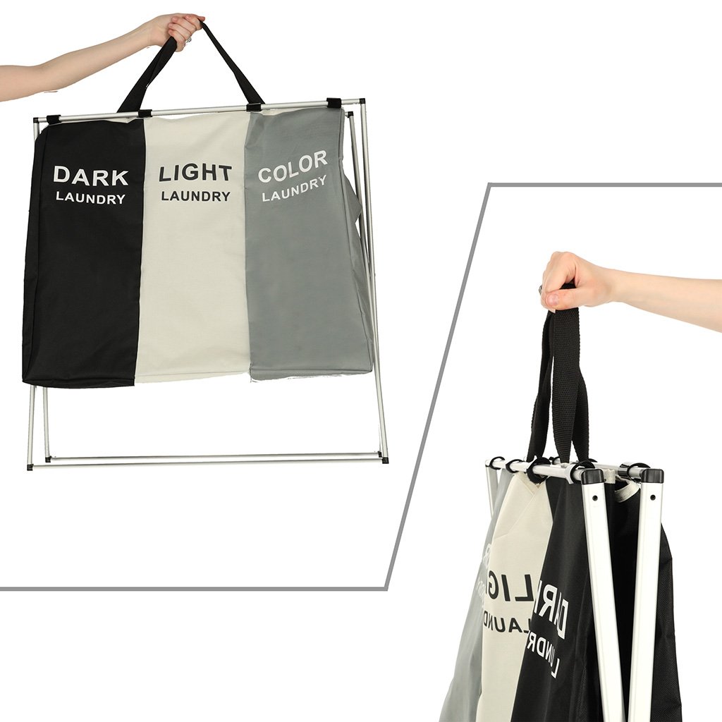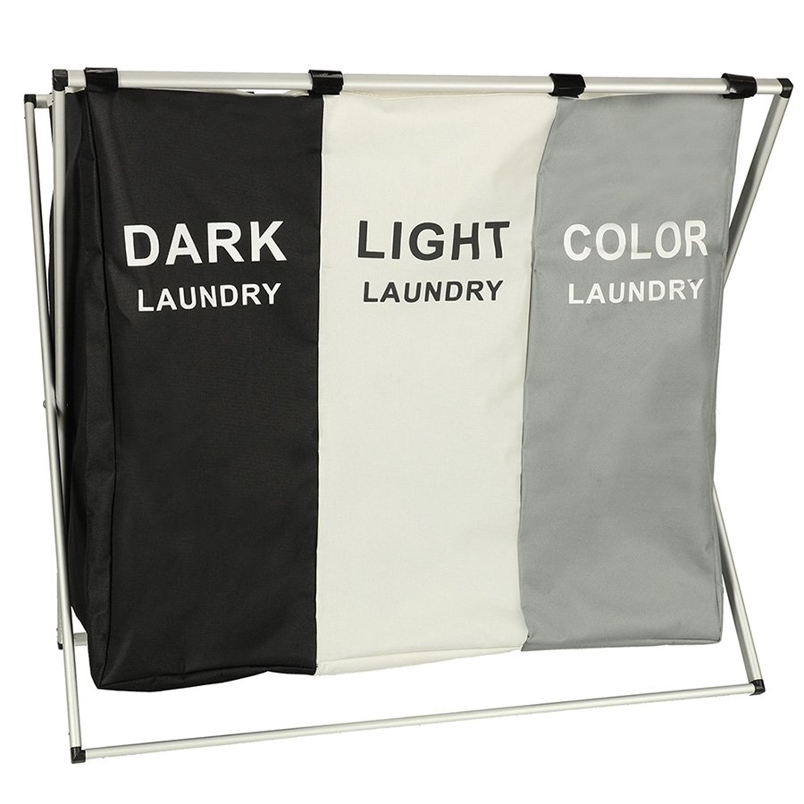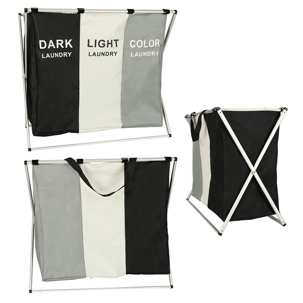 Ova je korpa savršena za one koji traže veliki organizator za pranje rublja s tri komore. Sadrži tri odvojene košare u jednoj! Svaki odjeljak označen je i dizajniran za različitu vrstu rublja – crno, bijelo i šareno – što olakšava sortiranje i organiziranje!