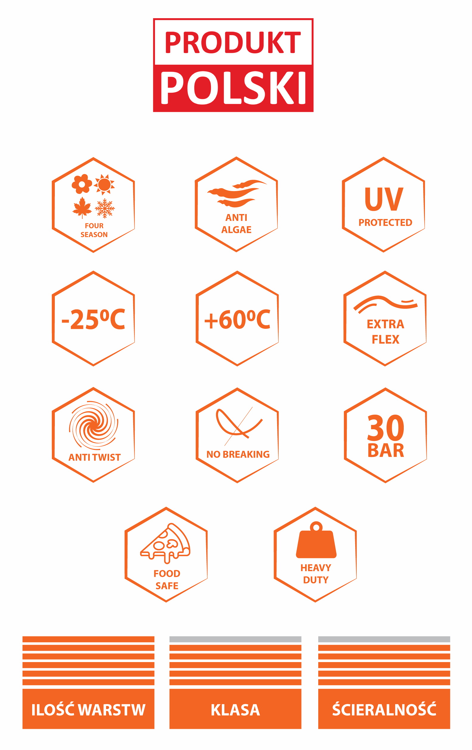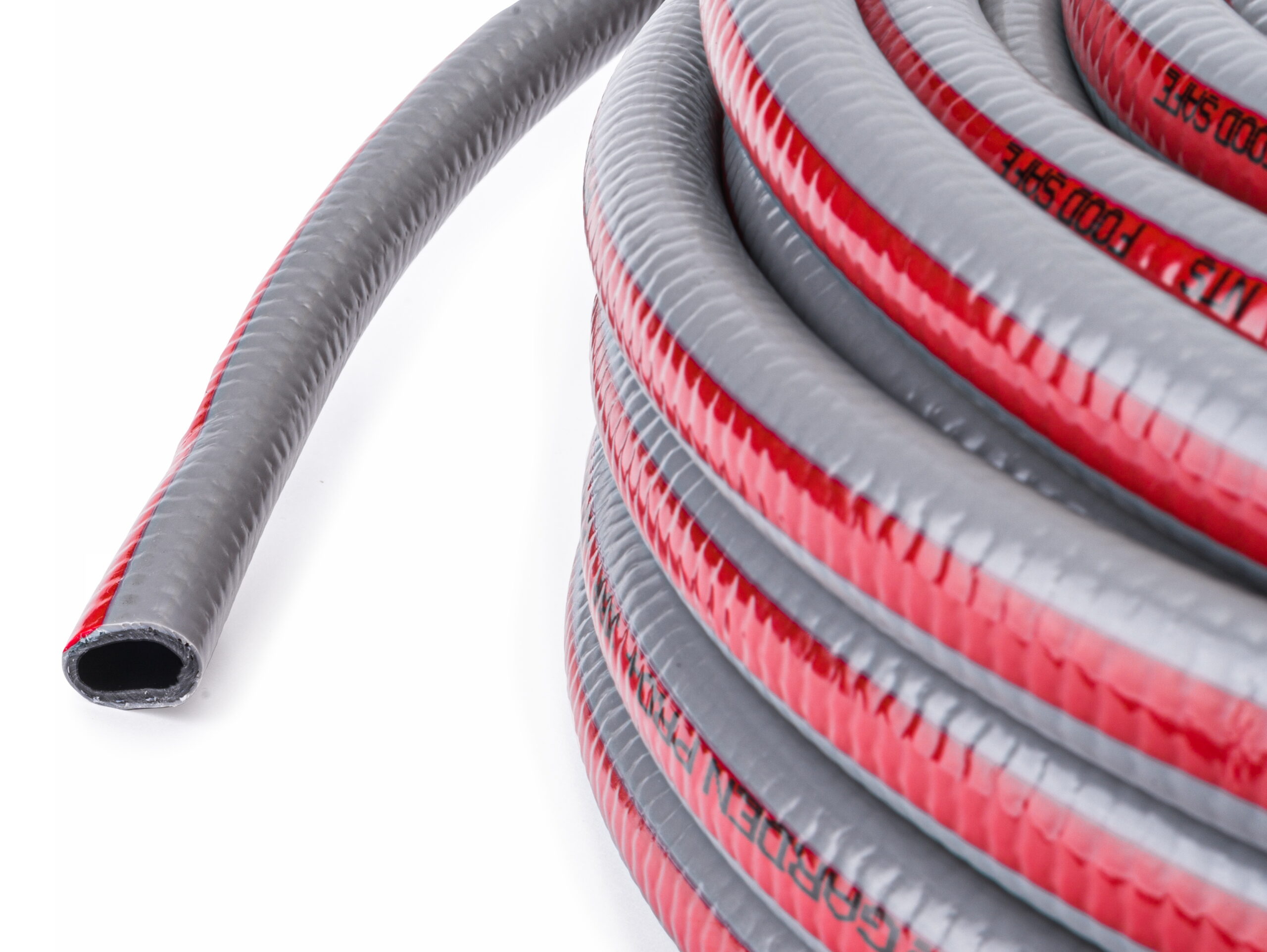 • 6-slojni  (unutarnji sloj izrađen od sirovina namijenjenih za kontakt s hranom, crna jezgra, križno pletena pletenica izrađena od najkvalitetnije poliesterske pređe, pokrovni premaz)