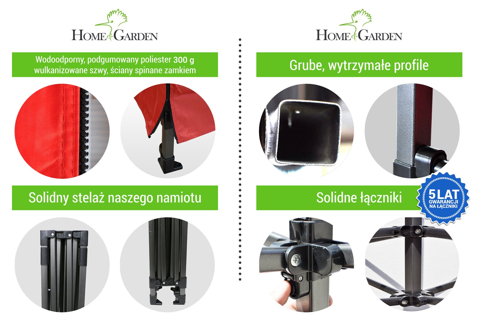 Okvir šatora ima dizajn škara, što omogućuje brzo postavljanje. Izrađen je od čeličnih profila premazanih visokokvalitetnom praškastom bojom. Profili su sastavljeni pomoću izdržljivih spojnica, a visina šatora može se podesiti pomoću teleskopskih nogu. Cijela nadstrešnica izrađena je od gumiranog poliestera od 300 g/m², što ga čini vodootpornim. Krov i zidovi pričvršćeni su čičkom i posebnim kopčama.