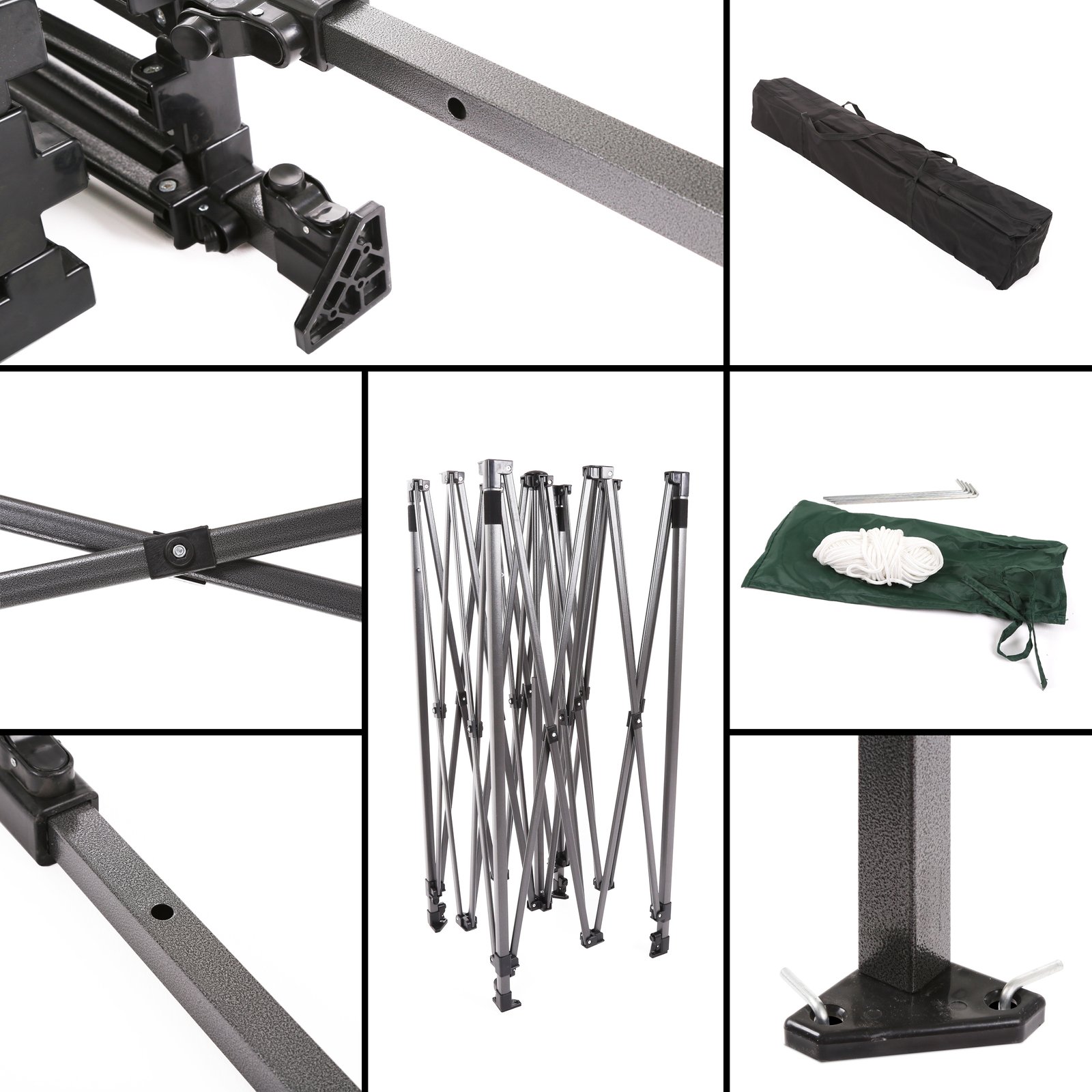 Okvir šatora ima dizajn škara, što omogućuje brzo postavljanje. Izrađen je od čeličnih profila premazanih visokokvalitetnom praškastom bojom. Profili su sastavljeni pomoću izdržljivih spojnica, a visina šatora može se podesiti pomoću teleskopskih nogu. Cijela nadstrešnica izrađena je od gumiranog poliestera od 300 g/m², što ga čini vodootpornim. Krov i zidovi pričvršćeni su čičkom i posebnim kopčama.