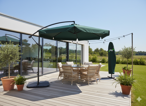 Moderan i stabilan vrtni suncobran idealan za terasu, vrt ili dvorište. Zahvaljujući vodootpornom materijalu i čvrstoj čeličnoj konstrukciji, pruža pouzdanu zaštitu od sunca i lagane kiše.