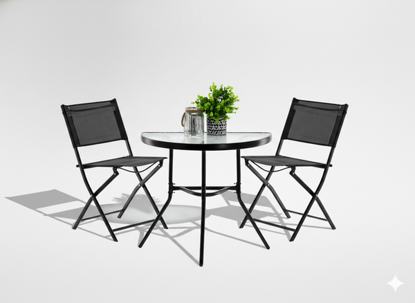 Elegantni i funkcionalni set sivog balkonskog namještaja. Ovaj kompaktni polustol savršen je za balkon, ali se može koristiti i na terasi ili u vrtu. Stolice su sklopive za jednostavno skladištenje i transport.