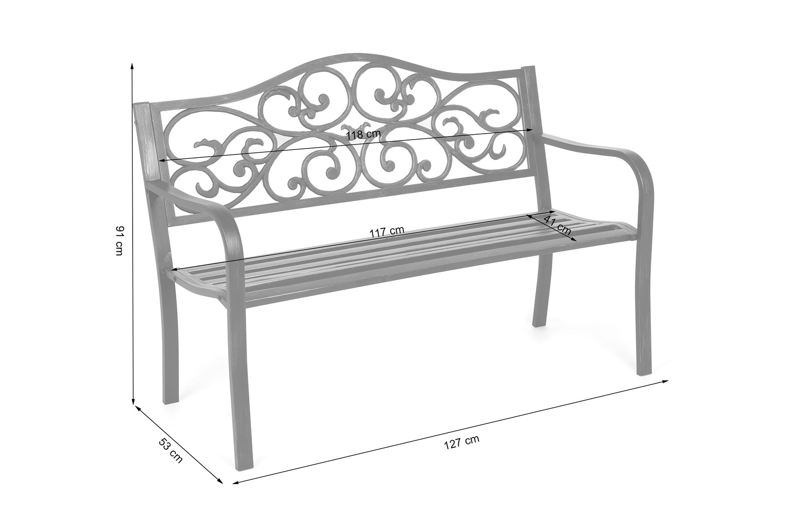 Elegantna vrtna klupa izrađena od metala s praškastim premazom. Zanimljiv ukras od lijevanog željeza ugrađen je u naslon klupe. Klupa je dovoljno lagana da se lako može premjestiti bilo gdje, čak i ako je to moguće samo jednoj osobi, ali dovoljno teška da osigura stabilnost i udobnost.