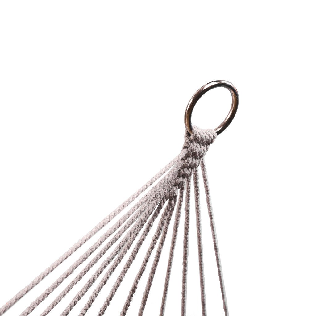 Vješalica je izrađena od gusto tkane pamučne užadi (65%), što joj daje visoku izdržljivost. Lako može izdržati težinu do 250 kilograma. Svijetla bež boja i rese na rubovima daju joj elegantan izgled koji će se savršeno uklopiti u svaki vrt postavljanje. Viseća mreža ovješena je o drveni okvir širine 100 centimetara, koji pruža odgovarajuću stabilnost i udobnost. Kad je smotan, zauzima vrlo malo prostora, što ga čini lakim za spremanje.