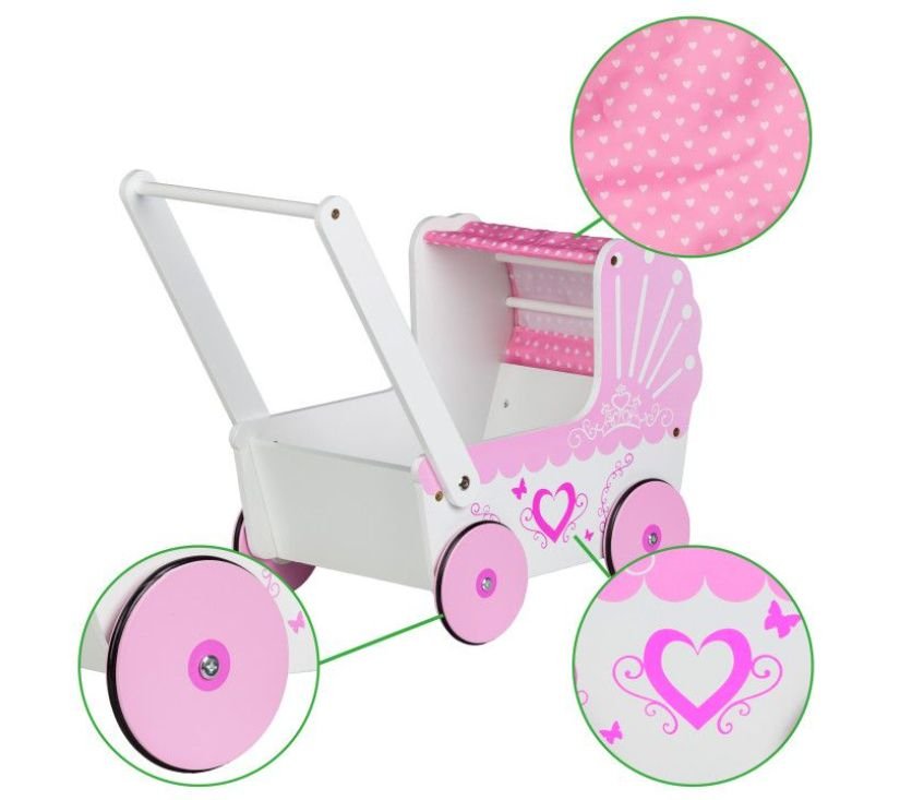 Konstrukcija kolica izrađena je od drveta . Igračka može poslužiti kao hodalica – pomoć u učenju hodanja. Hodalica ima četiri drvena kotača s gumenim trakama , koji pružaju stabilnost i štite pod od ogrebotina. Bočne strane kolica i baldahin su ukrašeni srcima.