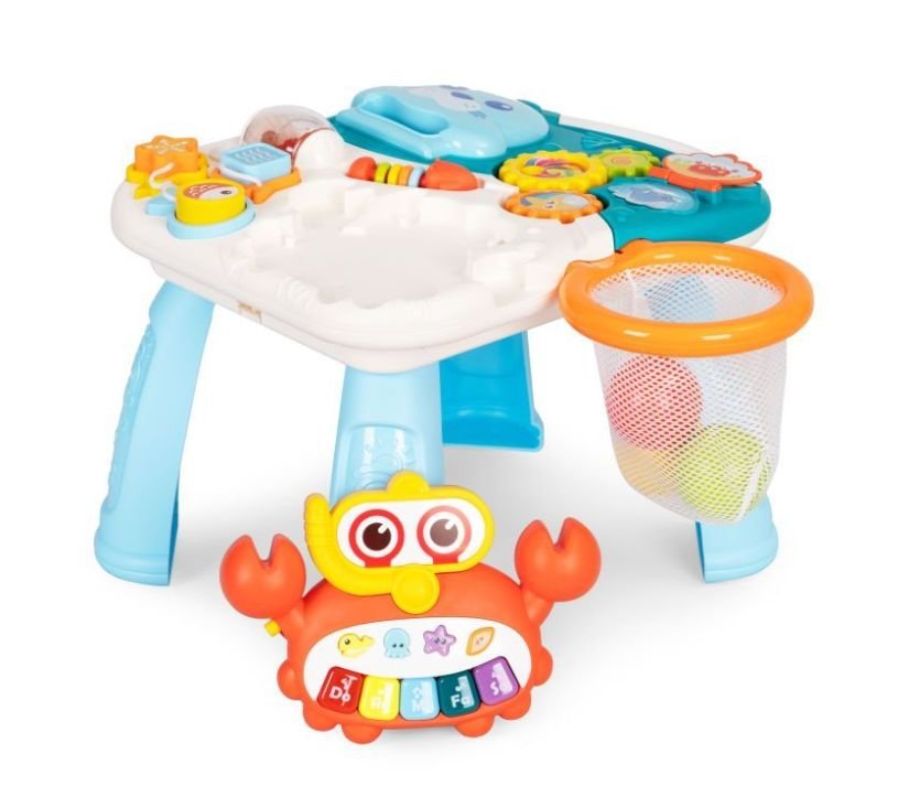 Gurkalica koja se lako pretvara u interaktivni stolić namijenjena je djeci od 12 mjeseci starosti. Ima odvojivu glazbenu ploču i pomične elemente koji potiču razvoj motoričkih vještina. Dodatna atrakcija je koš u koji možete ubaciti 3 šarene loptice koje se nalaze u setu.