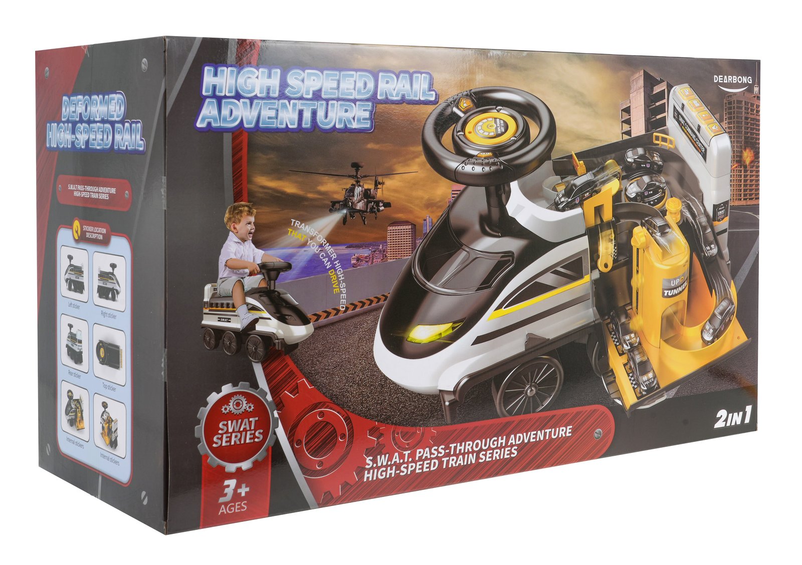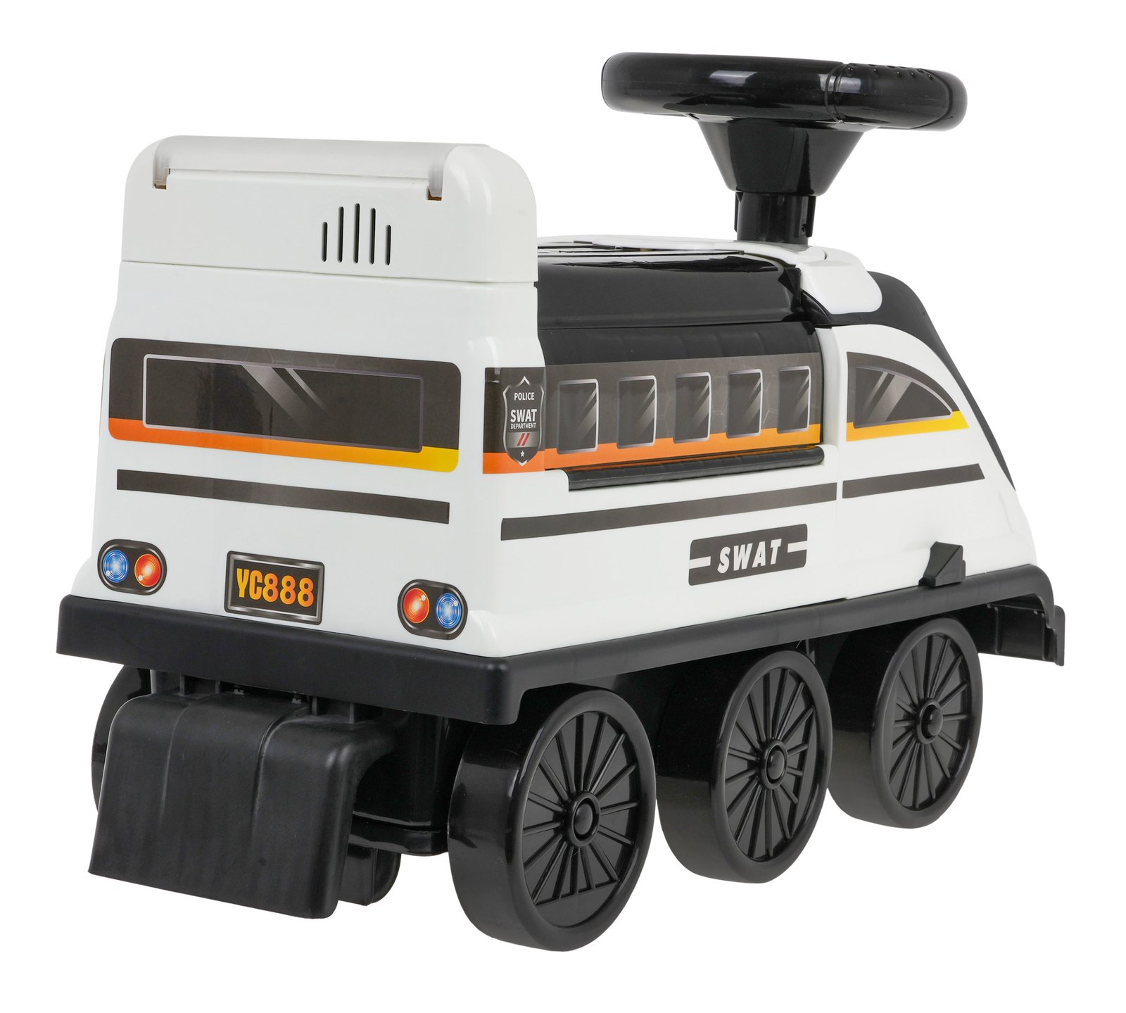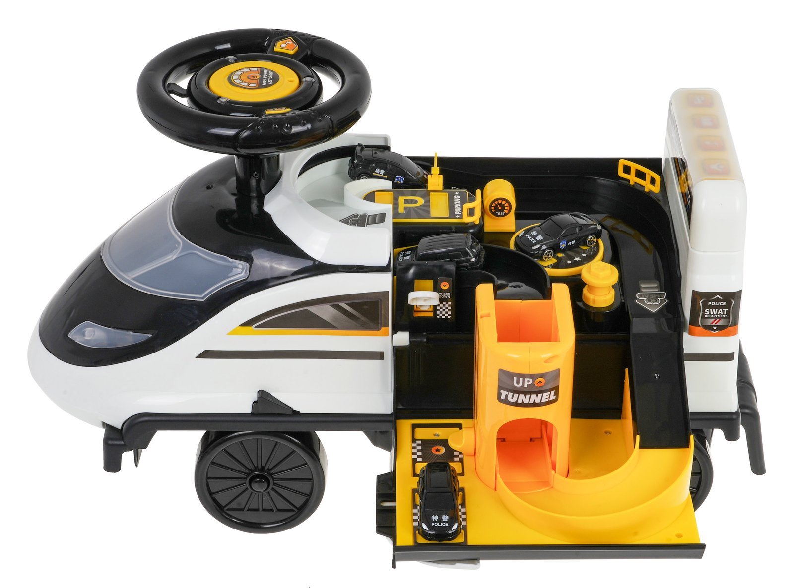 Interaktivna lokomotiva za vožnju s policijskim parkingom lot i zvučni i svjetlosni efekti je prijedlog za djecu od 3 godine. Igračka je izrađena od visokokvalitetne, izdržljive i netoksične plastike. Lokomotiva ima 6 kotača, uključujući dva prednja okretna kotača. Ispod sjedala nalazi se sklopivi policijski parking s toboganima, pomični lift, barijera za otvaranje, dizalo i rotirajući kotač. Svi pokretni elementi se kontroliraju ručno. Ispod parkinga nalazi se i spremište za dječje blago. Na prednjem dijelu lokomotive nalazi se i prednji prozor koji se otvara sa slobodnim prostorom za razne sitnice. Bočne strane lokomotive opremljene su uvlačivim naslonima za noge za djecu.