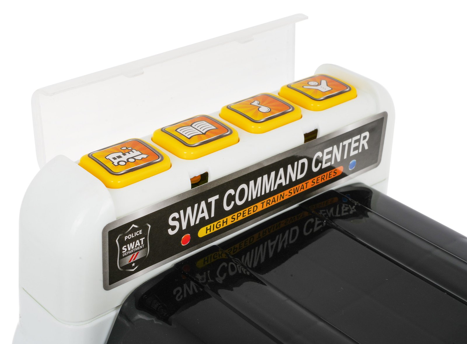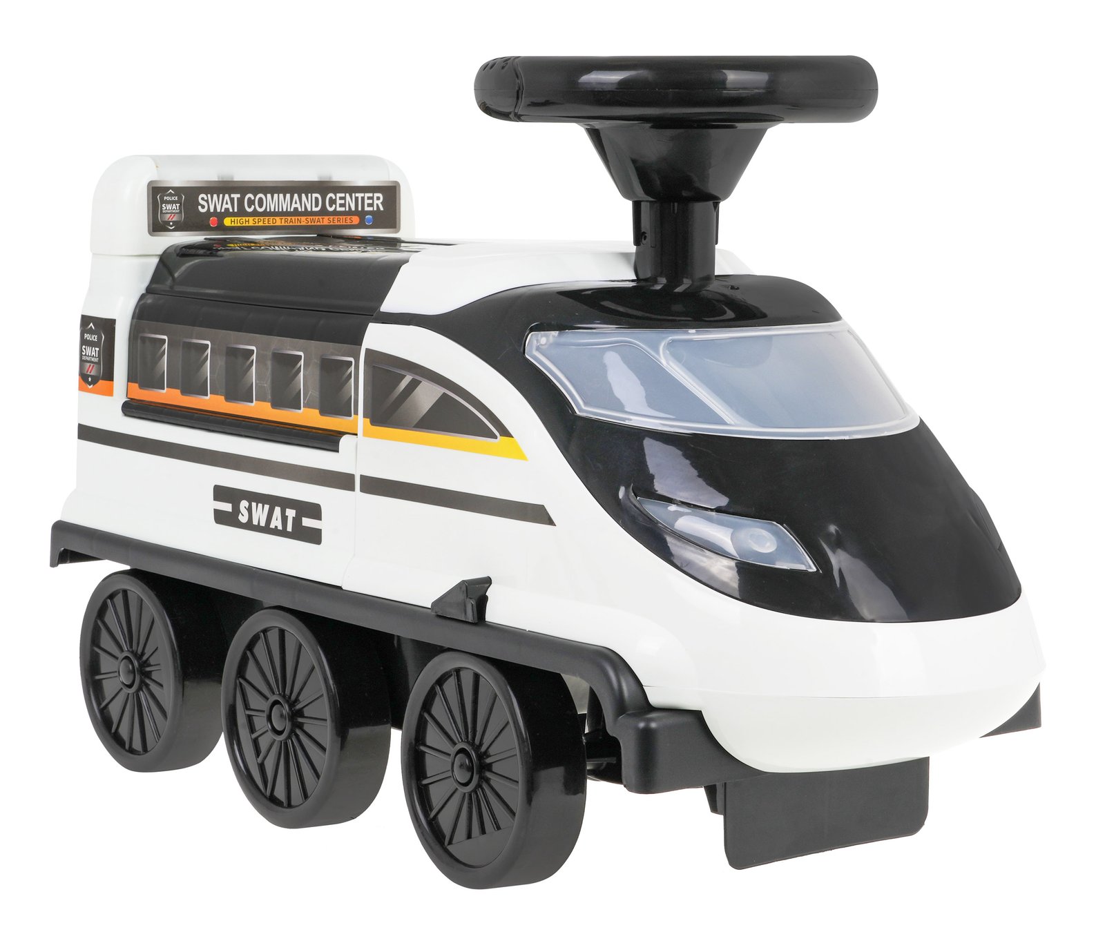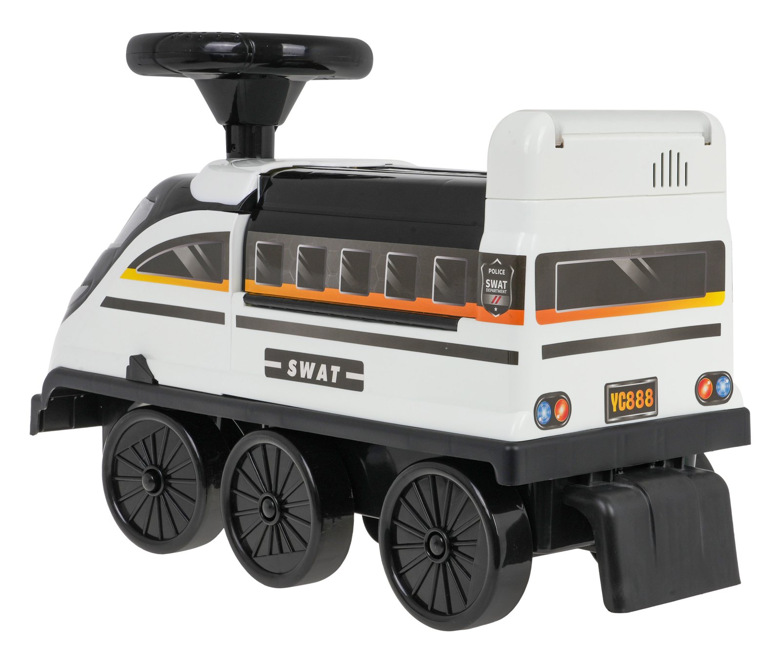 Interaktivna lokomotiva za vožnju s policijskim parkingom lot i zvučni i svjetlosni efekti je prijedlog za djecu od 3 godine. Igračka je izrađena od visokokvalitetne, izdržljive i netoksične plastike. Lokomotiva ima 6 kotača, uključujući dva prednja okretna kotača. Ispod sjedala nalazi se sklopivi policijski parking s toboganima, pomični lift, barijera za otvaranje, dizalo i rotirajući kotač. Svi pokretni elementi se kontroliraju ručno. Ispod parkinga nalazi se i spremište za dječje blago. Na prednjem dijelu lokomotive nalazi se i prednji prozor koji se otvara sa slobodnim prostorom za razne sitnice. Bočne strane lokomotive opremljene su uvlačivim naslonima za noge za djecu.