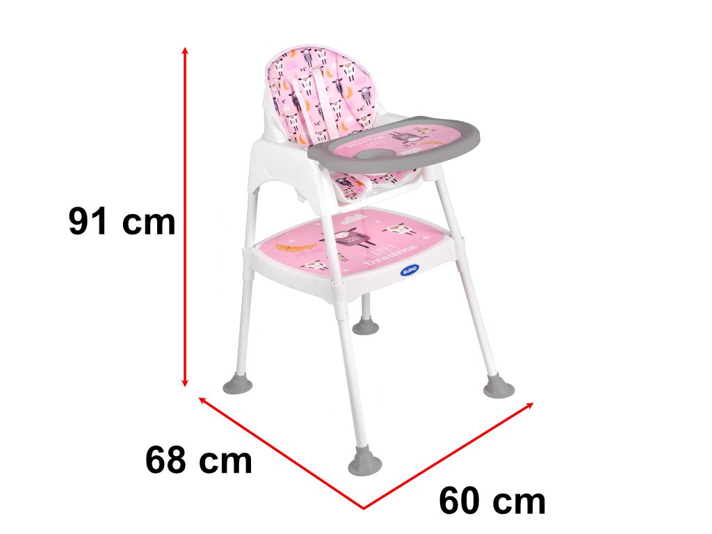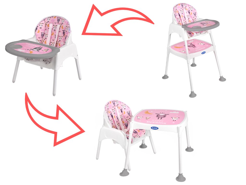 Stolica ima tri različite funkcije! Može se koristiti kao stolica za hranjenje djece od 6 do 36 mjeseci, a kada vaš mališan postane prevelik, možete je pretvoriti u stolicu i stolić. Ova kombinacija ne samo da će vam omogućiti udoban obrok, već je i odlična za crtanje i igru! U ovom obliku služit će svojoj svrsi do šeste godine!
