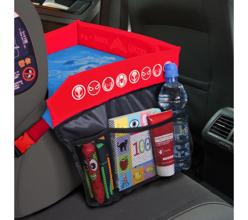 Izrađen od mekih komponenti. Visoke stranice stola sprječavaju padanje predmeta. Stol ima velike džepove od elastične mreže u koje će stati pribor. Podesivo na autosjedalicu s remenima.