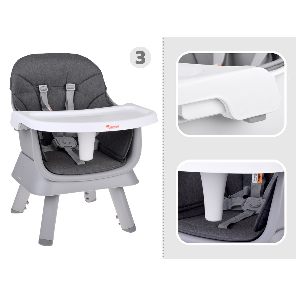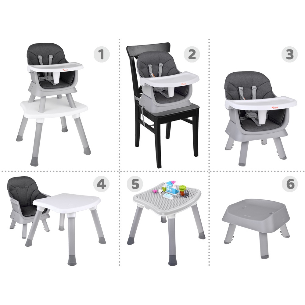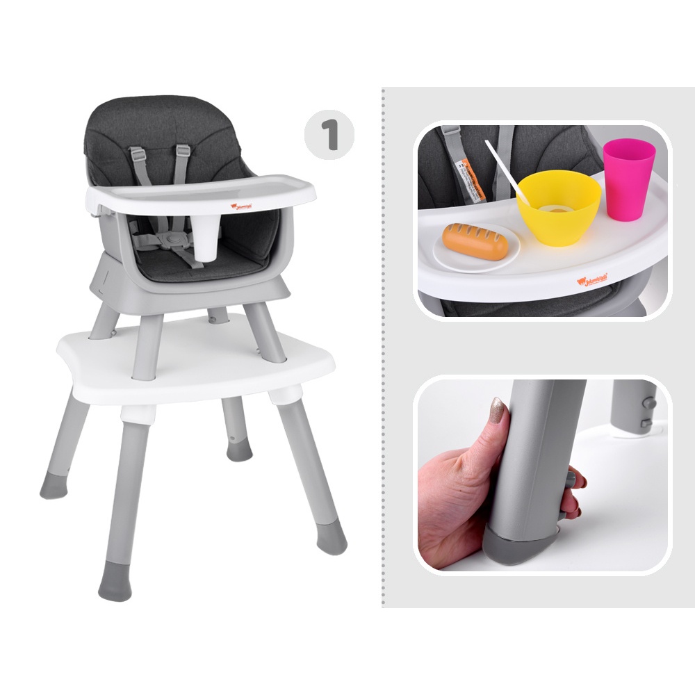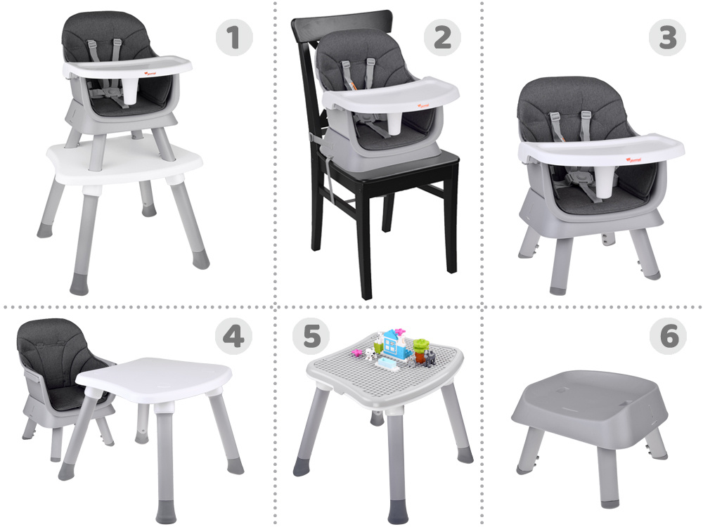 Višenamjenska stolica 6 u 1 je vrhunsko rješenje “sve u jednom” koje štedi prostor, vrijeme i novac. Zamjenjuje nekoliko komada namještaja, a istovremeno čini svakodnevno hranjenje i igru ugodnijim i za djecu i za roditelje.