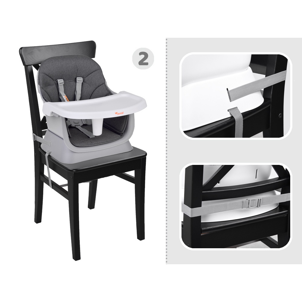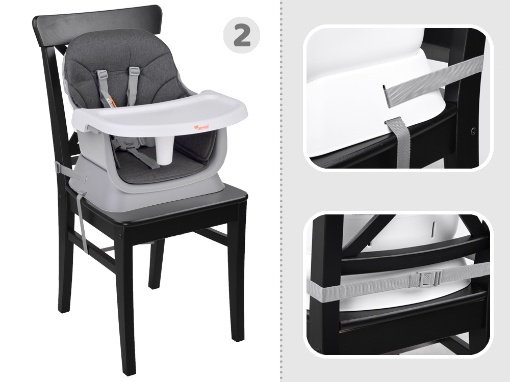 Pričvršćivanje stolice za blagovaonski stol – Sigurno pričvrstite sjedalo na standardnu blagovaonsku stolicu pomoću podesivih sigurnosnih remena i protukliznih nožica. Vaša beba sada se može pridružiti obitelji za stolom i početi učiti dobro ponašanje za vrijeme obroka promatranjem i oponašanjem.