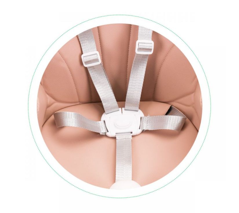 Stolica je izrađena od najkvalitetnijih materijala. Sjedalica se može pretvoriti u manju stolicu za stariju djecu. Mekana navlaka sjedala može se slobodno ukloniti radi lakšeg čišćenja. Za sigurnost djeteta brinu sigurnosni pojasevi u 5 točaka i blokada protiv klizanja. Zahvaljujući velikim plastičnim jastučićima na nogama, stolica je vrlo stabilna. Pladanj ima posebno udubljenje koje sprječava prolijevanje bilo čega po podu.