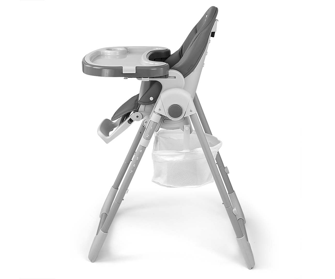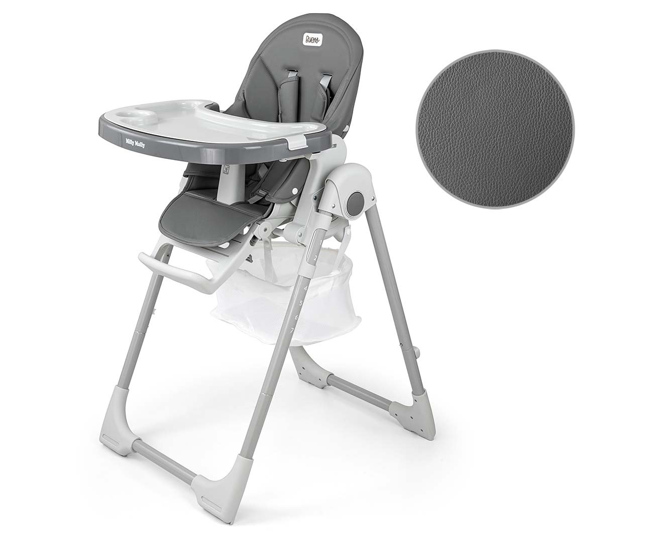 Presvlaka visoke stolice izrađena je od ekološke kože i ima ekstra meku podstavu namijenjenu najmlađima. Ovaj proizvod ima 5 točaka regulacije pojaseva, te dodatnu zaštitu za najmlađu djecu, koja štiti prije ispadanja. Opremljen je pladnjem za odlaganje, na stražnjoj stolici nalazimo posebno pričvršćivanje za pladanj, naslon za leđa i noge možemo otvoriti u položaj za ležanje, možemo regulirati sjedalo gore i dolje na 7 razina, noge su sigurne od posebne gume na dnu.