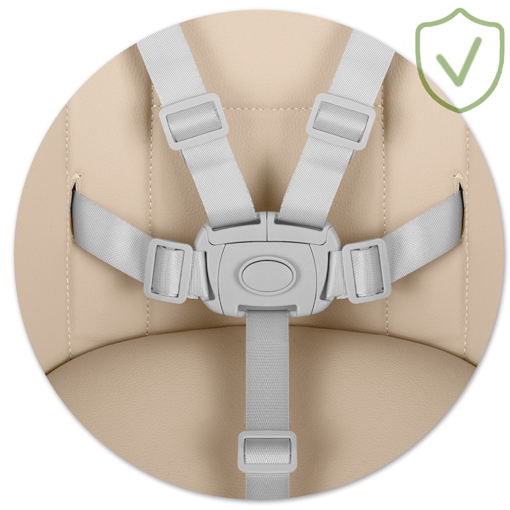 Dodatne sigurnosne značajke uključuju sigurnosni pojas s 5 točaka koji sprječava klizanje djeteta iz sjedalice. Može se potpuno ukloniti kada više nije potreban.