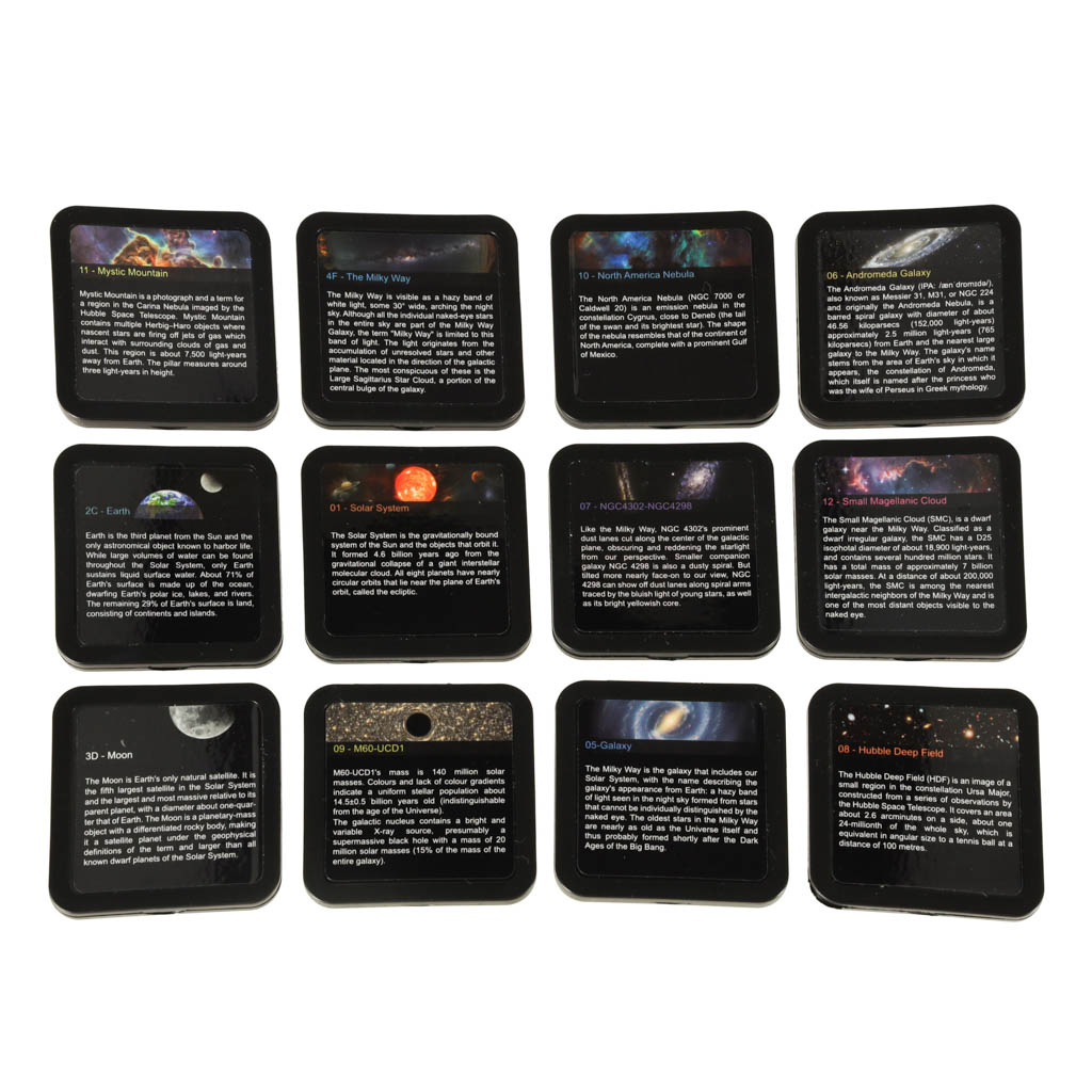Set sadrži 12 diskova s ​​različitim slikama , uključujući: Zemlju, Sunčev sustav, Mliječni put i Mjesec. Na svakom disku je napisan i kratak opis (na engleskom), što vam omogućuje da saznate više o svemirskim objektima.