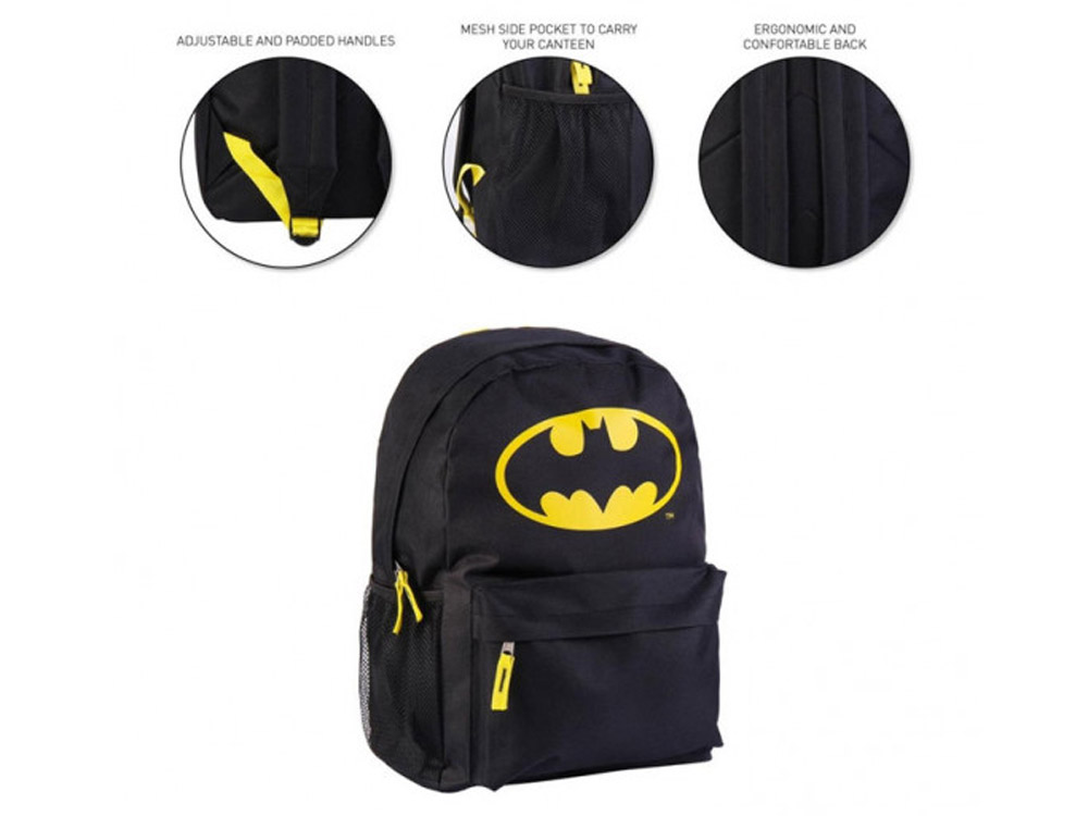 Ovaj moderan ruksak dobro će poslužiti i u školi i na izletu. U prostrani pretinac smjestit će se sve potrebne stvari, a široke naramenice osiguravaju udobno nošenje. Batman ruksak također je savršena ideja za poklon. Svaki ljubitelj superheroja sigurno će biti sretan s takvim poklonom. Ruksak ima karakterističan uzorak s logom Batmana u crnoj i žutoj boji. Ruksak ima jedan prostrani pretinac u koji se mogu smjestiti sve potrebne stvari, poput knjiga, bilježnica, pernice, doručka ili boce vode. Ruksak ima široke, podesive naramenice obrubljene mekanim materijalom, što osigurava udobnost nošenja čak i tijekom dužeg vremena.