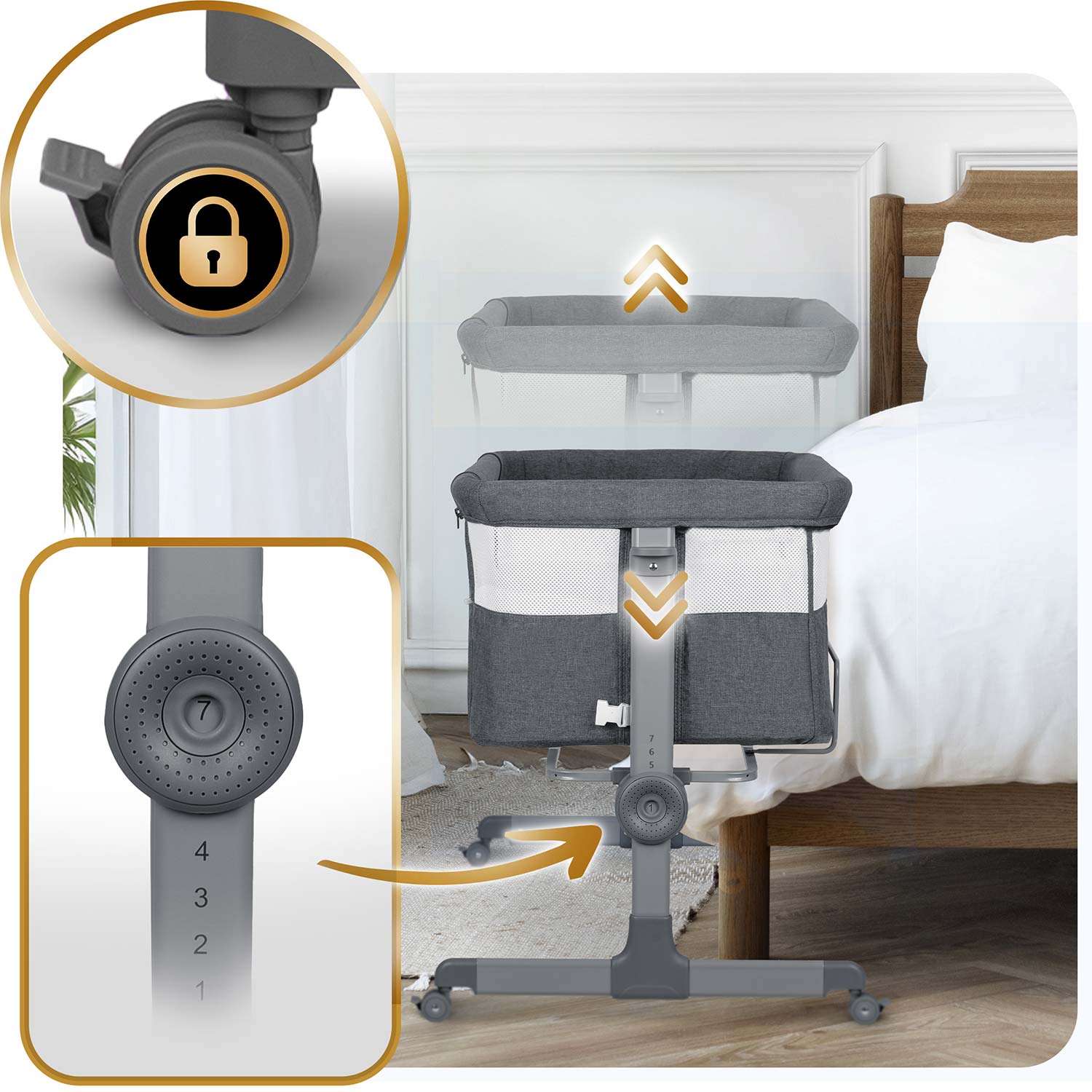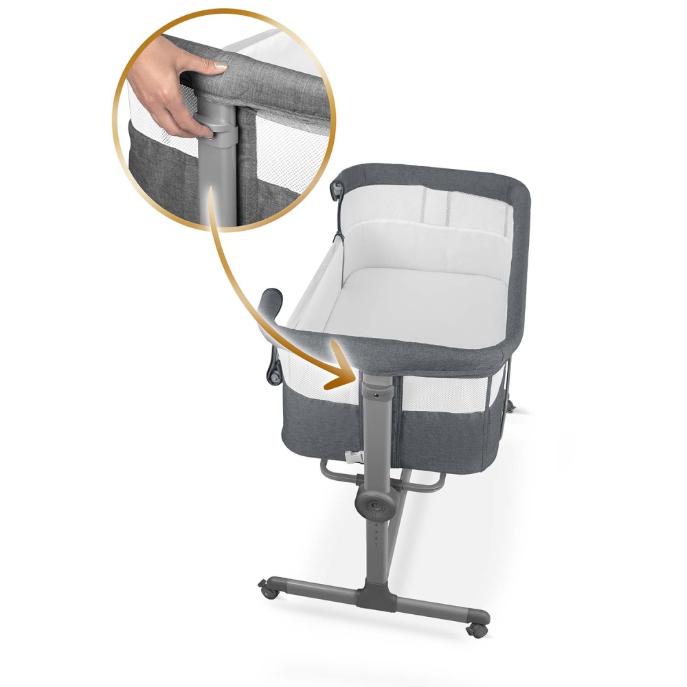 Bočni krevetić ima neovisno podešavanje visine s obje strane, što omogućuje prilagodbu razini kreveta roditelja i osigurava udobnost i za bebu i za roditelje.