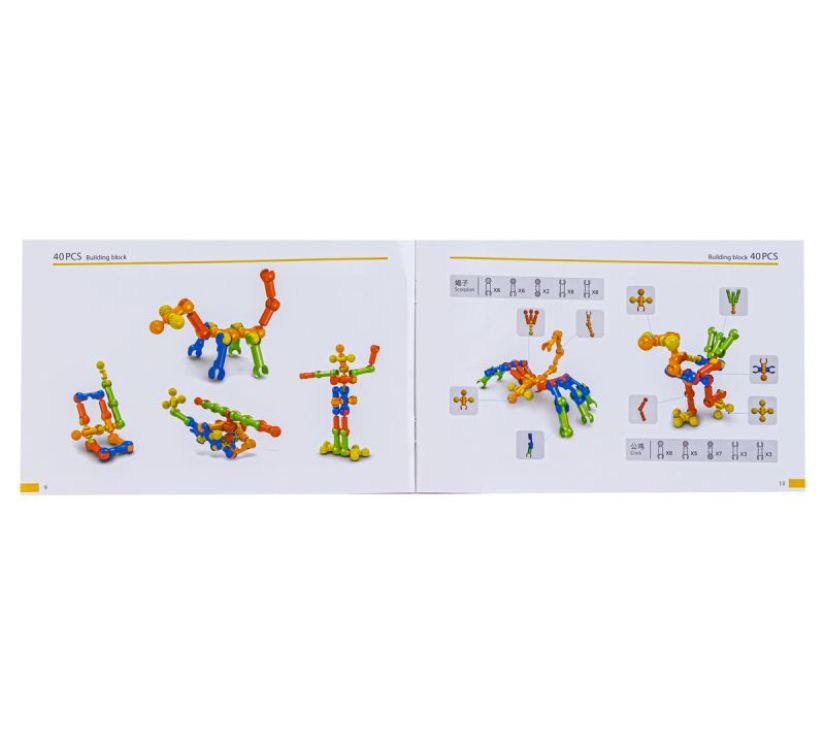 Set također uključuje slikovne upute o tome kako kombinirati blokove i uzorke rasporeda, npr. škorpiona ili autića. Ako kupite više blokova – možete ih koristiti za izgradnju još većih i naprednijih igračaka.