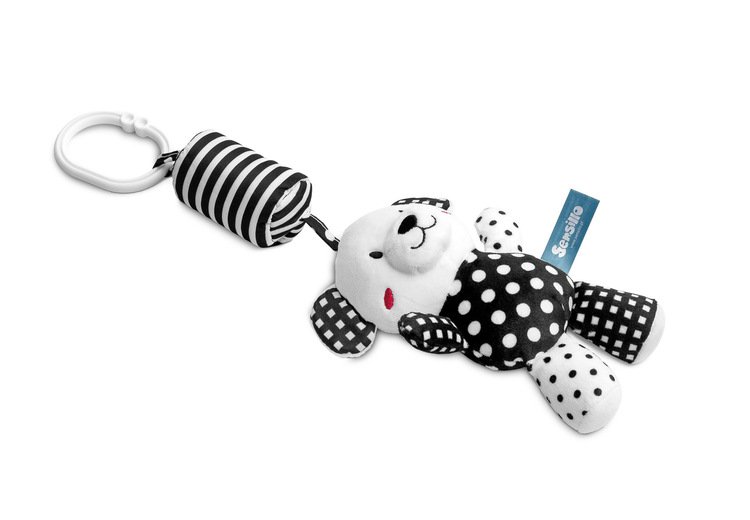 Privjesak za kolica od bijelog pliša privlači pažnju djeteta ne samo svojom karakterističnom crno-bijelom bojom, već i zvončićem ugodnim za uho. Maskota ima univerzalni držač koji omogućuje pričvršćivanje bilo gdje, kod kuće ili u pokretu. Dodatna atrakcija za bebu su šuštanje ušiju i cviker skriven u trbuhu.
