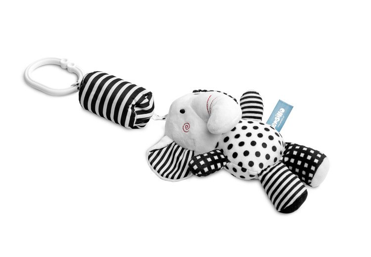 Privjesak za kolica od bijelog pliša privlači pažnju djeteta ne samo svojom karakterističnom crno-bijelom bojom, već i zvončićem ugodnim za uho. Maskota ima univerzalni držač koji omogućuje pričvršćivanje bilo gdje, kod kuće ili u pokretu. Dodatna atrakcija za bebu su šuštanje ušiju i cviker skriven u trbuhu.