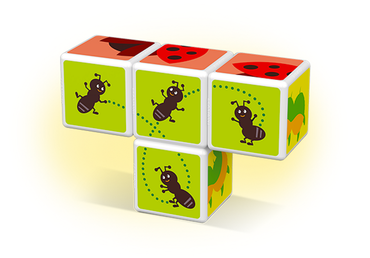 Set za igru uključuje 4 kocke i 3 karte. Slijedite 6 ideja za gradnju na temu kukaca i zabavite se rekonstruirajući ih.
