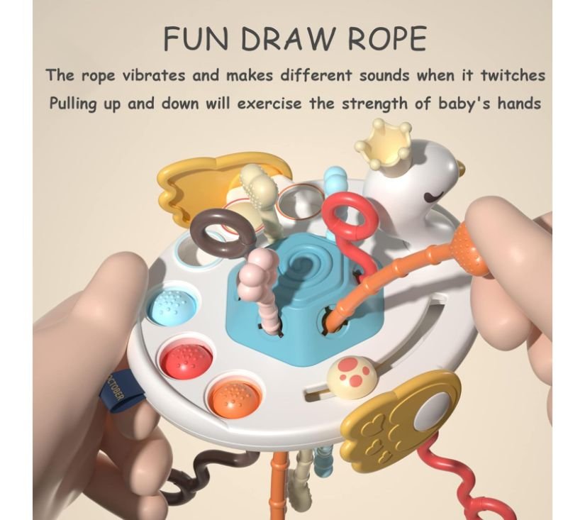 Imaj 6 užadi različitih tekstura i oblika. Uže se može povlačiti s jedne strane na drugu, što može vježbati finu motoriku bebine ruke. Različite teksture ne samo da donose bogato taktilno iskustvo, već također doživljavaju različite poteškoće i zvukove vibracija prilikom povlačenja užeta.