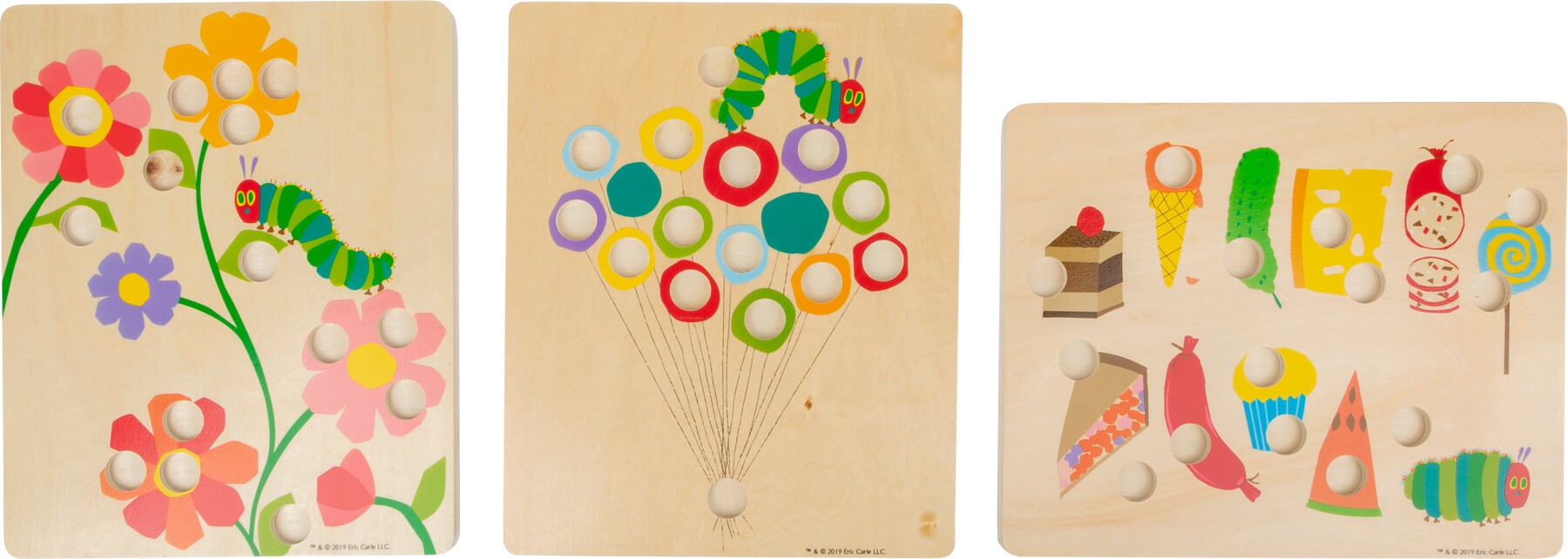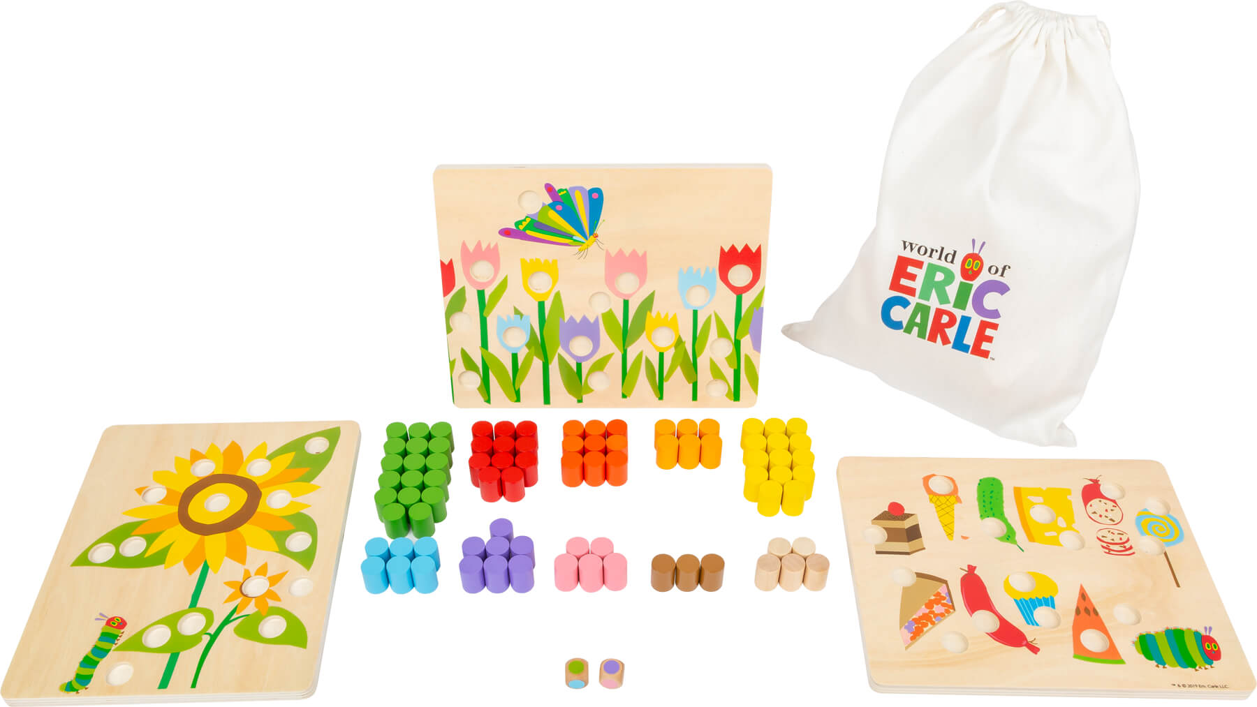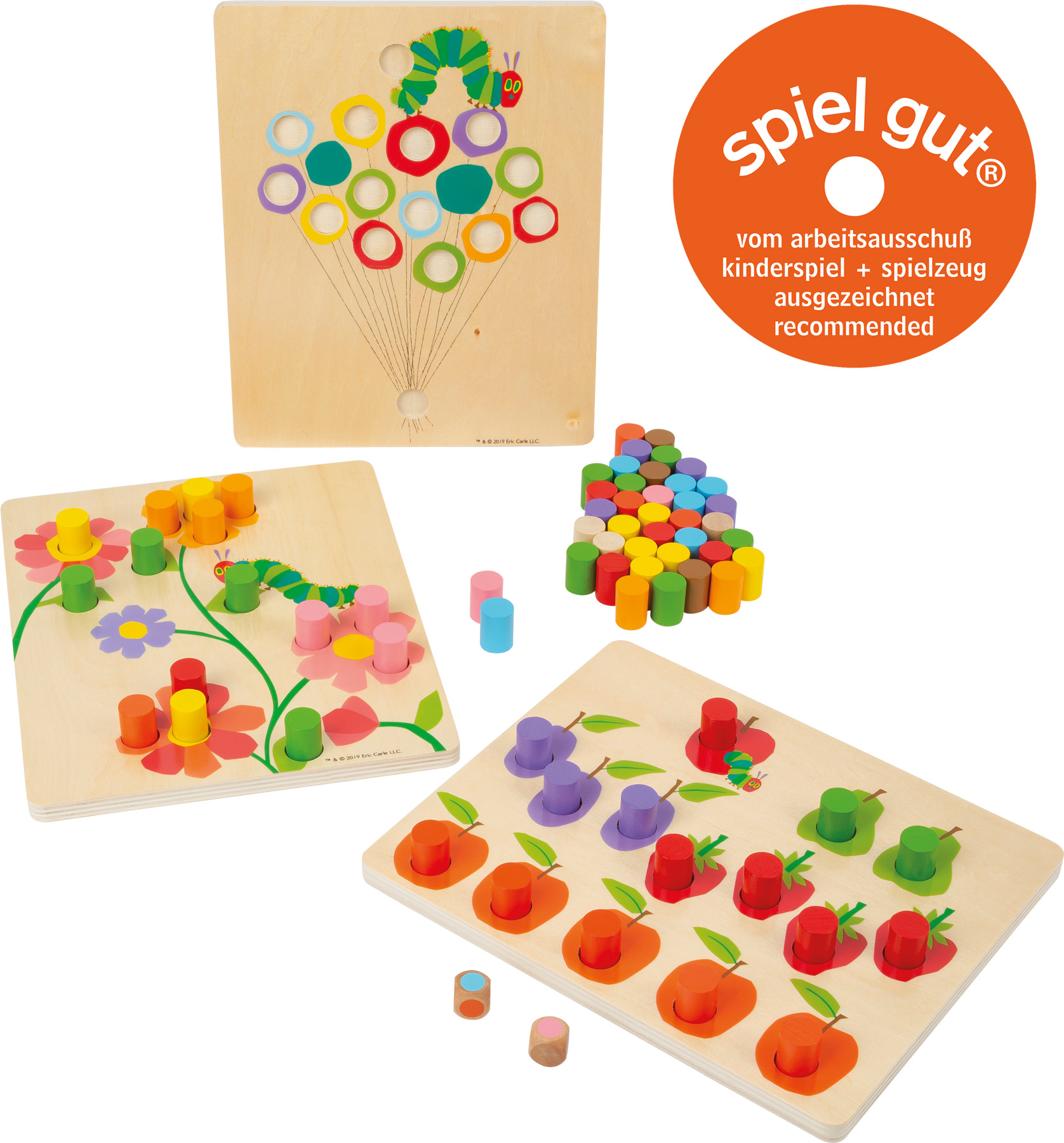 Koja boja gdje pripada? Uz ovu igru razvrstavanja po bojama, mladi ljubitelji igre vrlo gladna gusjenica zaigrano uče prepoznavati i razvrstavati boje. U ovoj igri potrebno je dovršiti šest slika uz pomoć obojenih kockica i obojenih dijelova za igru. To je edukativna zabava koja se može igrati u dvije varijante, a osim što trenira prepoznavanje boja, također trenira finu motoriku! Čvrsta drvena ploča ima visokokvalitetne ispise s obje strane i može se zajedno sa svim ostalim materijalom za igru pohraniti u jutenu vrećicu. Idealno kada ste u pokretu.