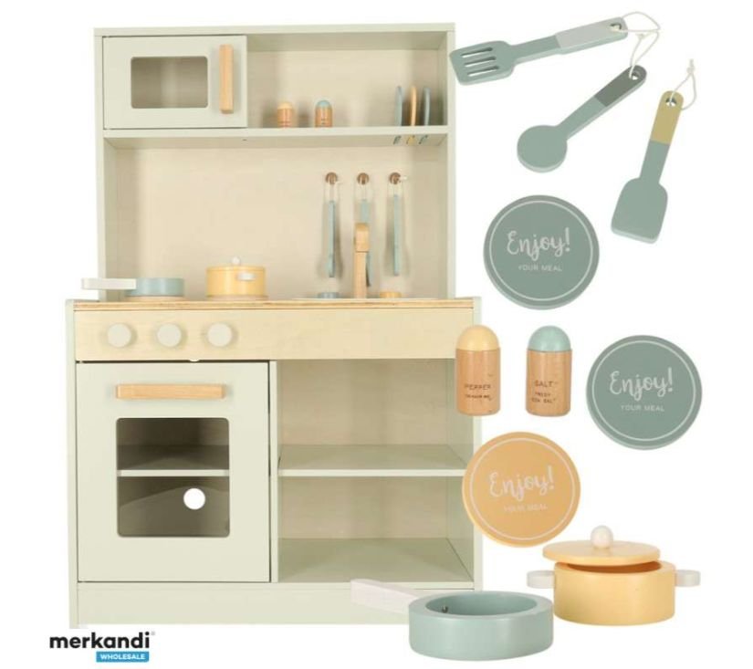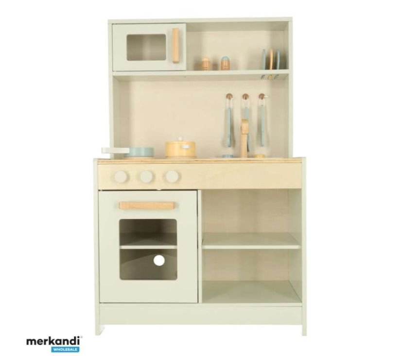 Drvena dječja kuhinja u svijetloj boji – savršeno će se uklopiti u svaku dječju sobu. Ima brojne uređaje i pribor – uključujući sudoper, pećnicu, lonac. Potiče kreativno razmišljanje i aktivnu igru. Dimenzije: 91x58x28 cm.