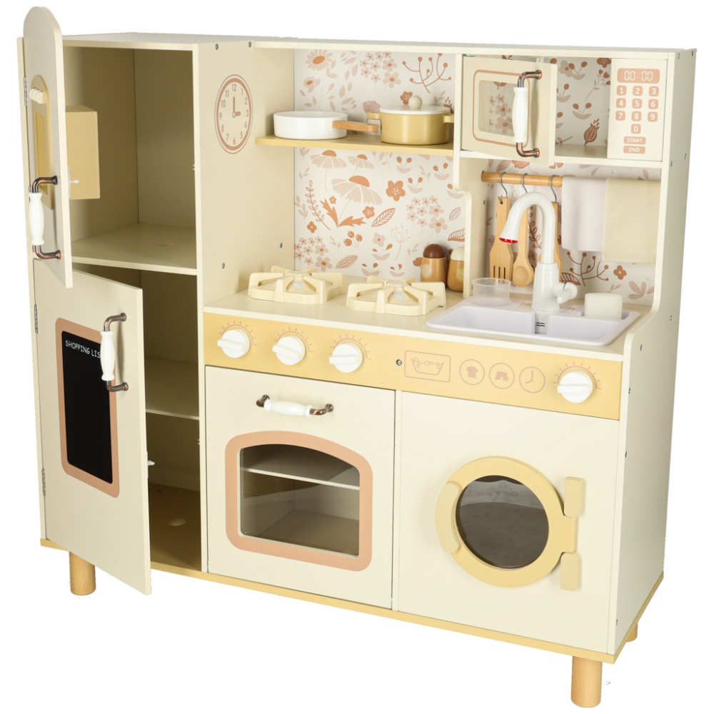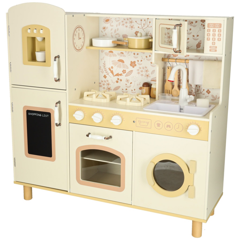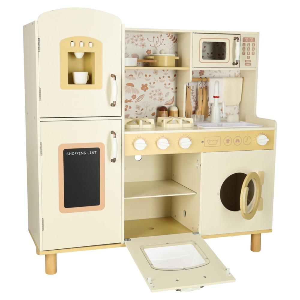 Uz drvenu dječju kuhinju naći ćete pribor poput šalice , lonca , tave , kuhinjskih lopatica , soljenke i paprenke , kao i perilicu rublja , mikrovalnu pećnicu , pećnicu , sudoper s funkcijom izlijevanja i ormariće za pohranu . S time kreativna igra postaje svakodnevna aktivnost, a dijete uči slobodno se kretati i održavati svoj kuhinjski prostor urednim.