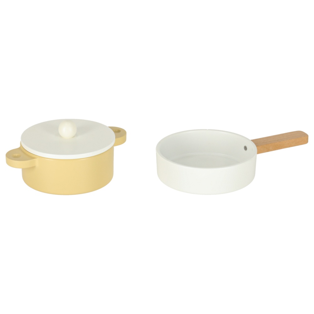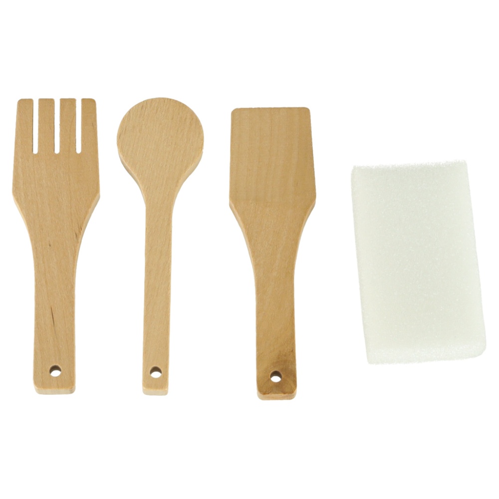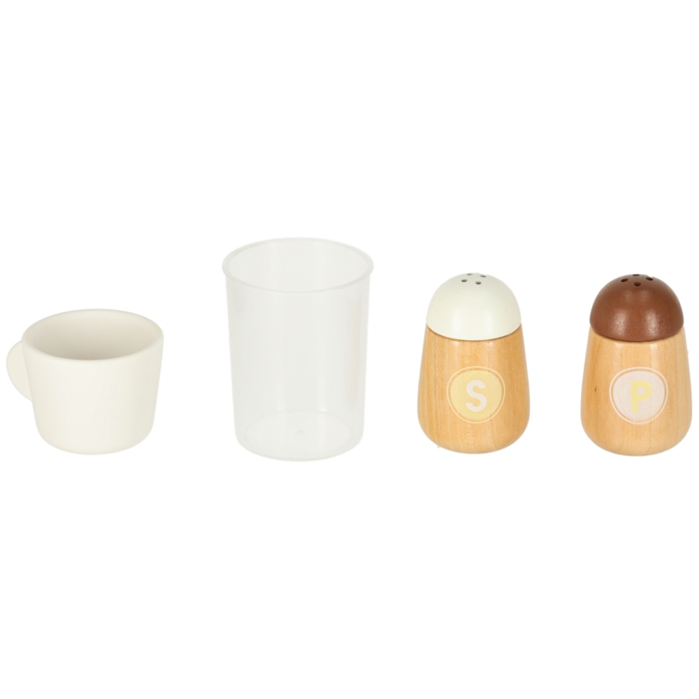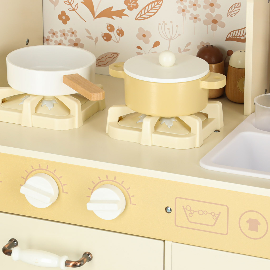 Uz drvenu dječju kuhinju naći ćete pribor poput šalice , lonca , tave , kuhinjskih lopatica , soljenke i paprenke , kao i perilicu rublja , mikrovalnu pećnicu , pećnicu , sudoper s funkcijom izlijevanja i ormariće za pohranu . S time kreativna igra postaje svakodnevna aktivnost, a dijete uči slobodno se kretati i održavati svoj kuhinjski prostor urednim.