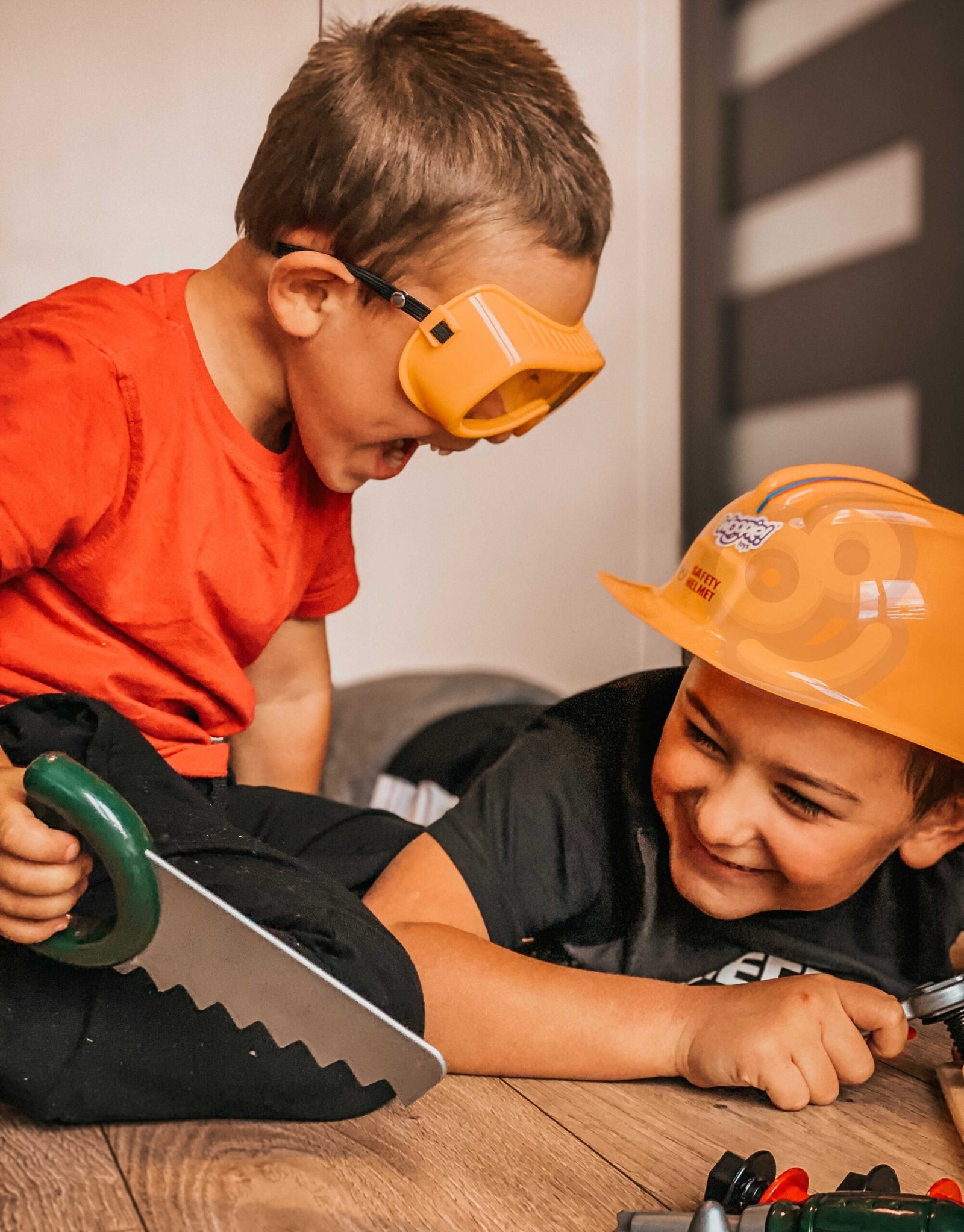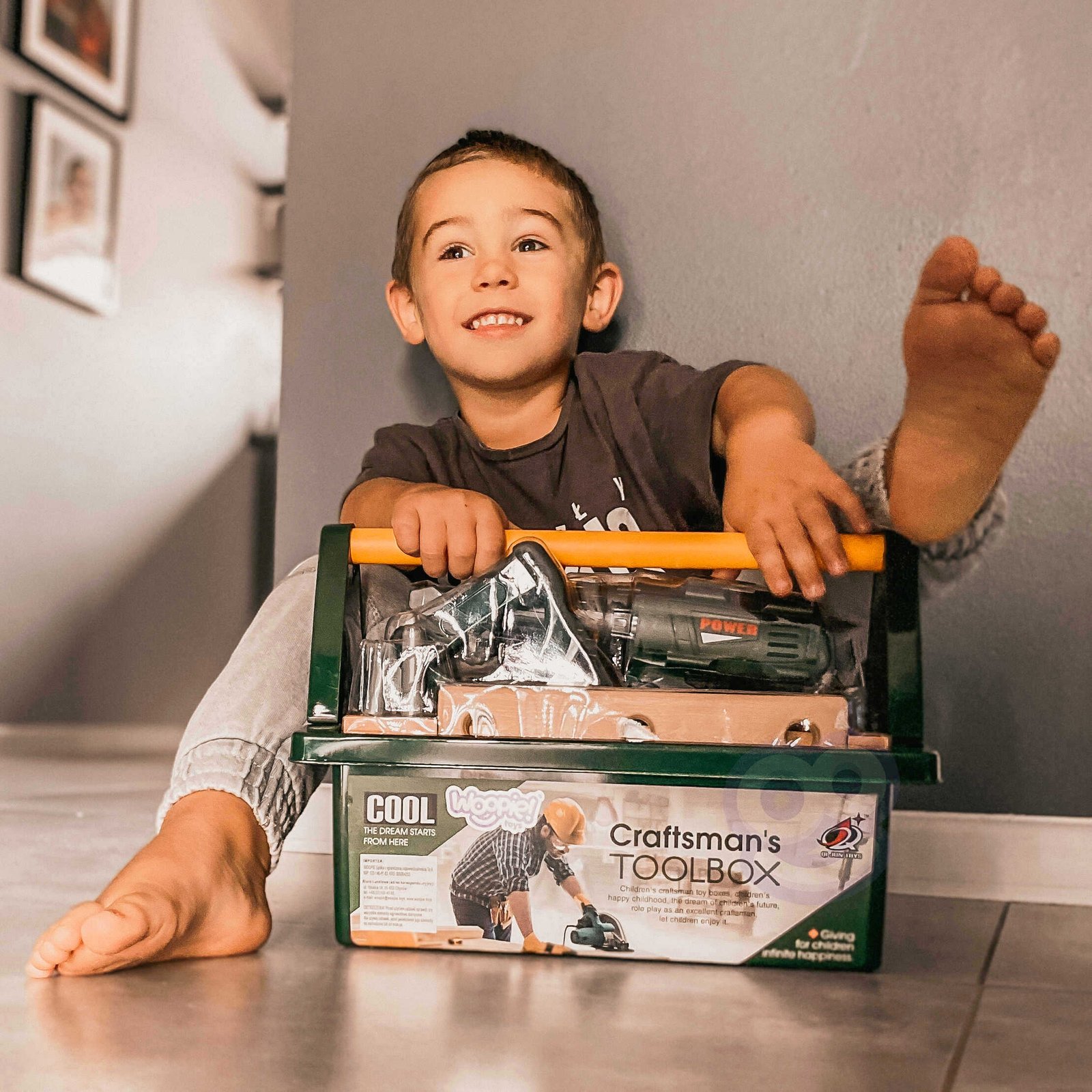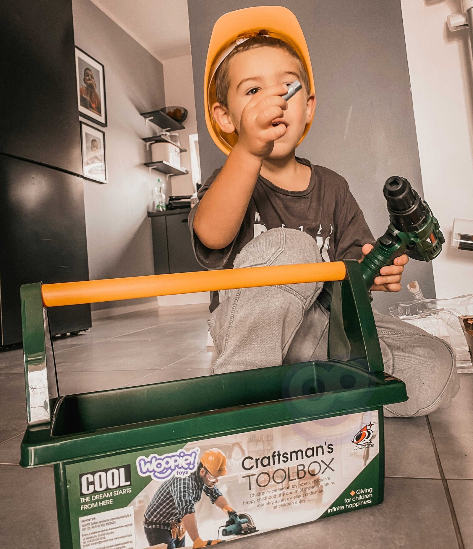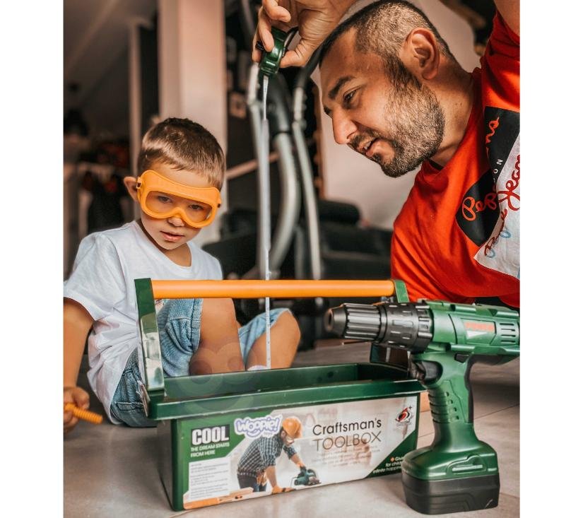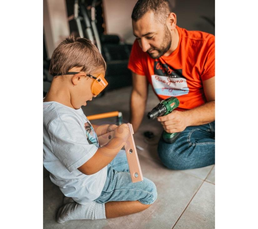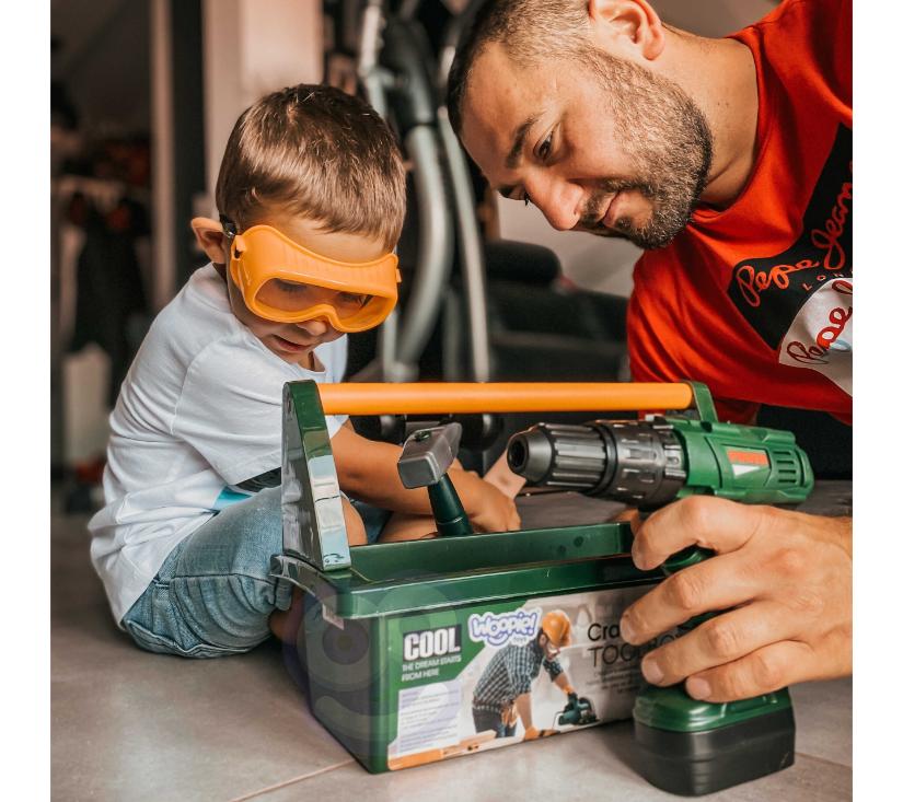 Kutiju s alatom s odvijačem i bušilicom kreirala je dječja omiljena tvrtka WOOPIE . Set uključuje  tamnozelenu, prostranu kutiju za alat  s  udobnom žutom ručkom  i  15 elemenata . Među alatima djeca će pronaći   akumulatorski odvijač i bušilicu s 3 izmjenjiva vrha . Odvijač i bušilica oponaša pravi uređaj zahvaljujući  svojim zvukovima i rotirajućem vijku . Dodatno, set sadrži  pilu s udobnom ručkom, čekić, ključ i dvije plastične ploče s rupama za uvrtanje vijaka  (4 u setu)  ili zabijanje čavala  (2 u setu). Ovaj set pružit će izvrsnu zabavu svakom malom DIY entuzijastu, a istovremeno će podržati razvoj ručnih vještina.
