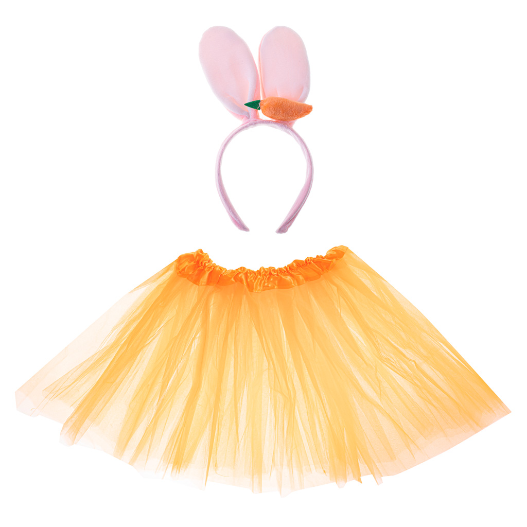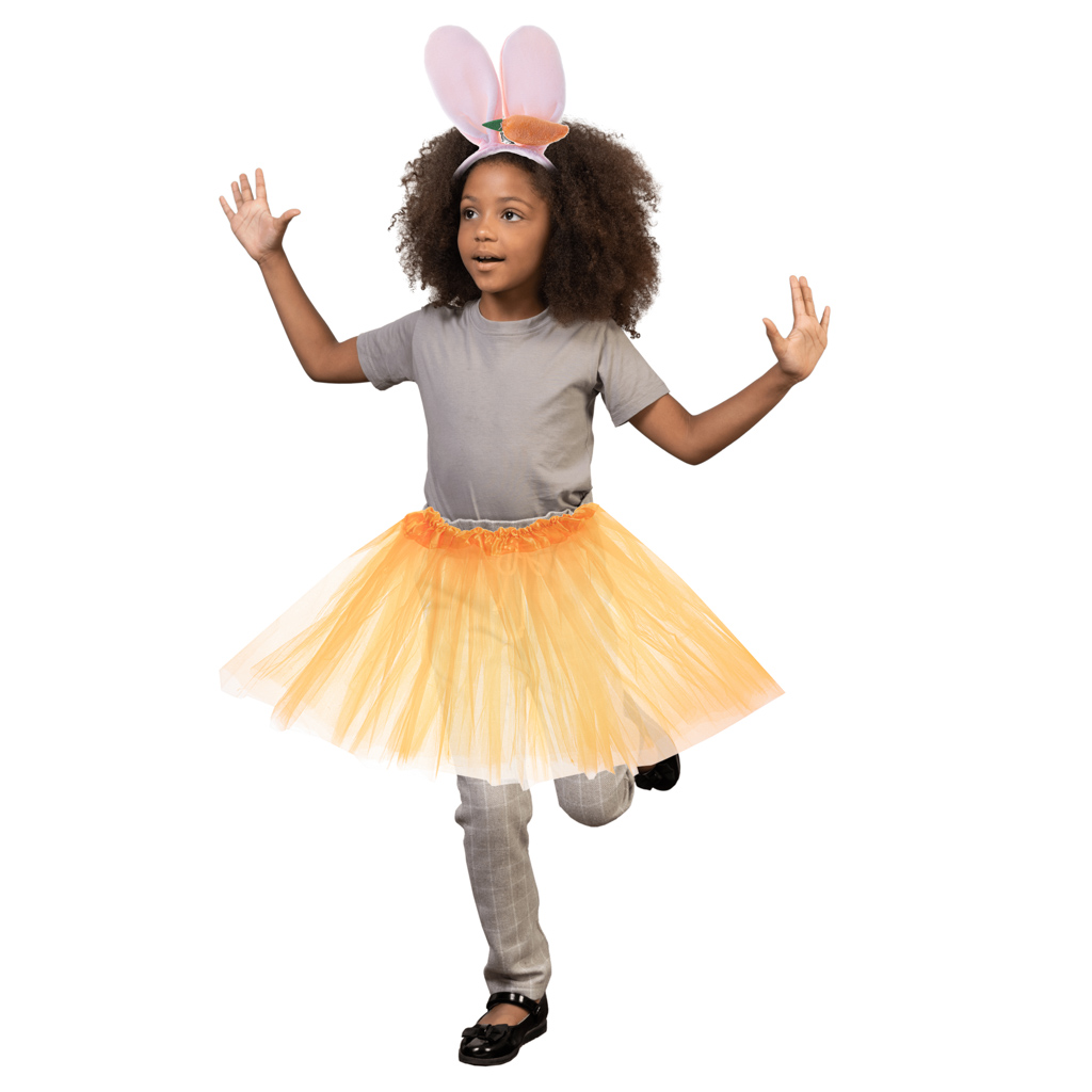 Set uključuje traku za glavu s mekim ušima i ukusnom mrkvom, ali i narančastu suknju od tila – vaše će se dijete moći maskirati u dobro poznatu životinju!