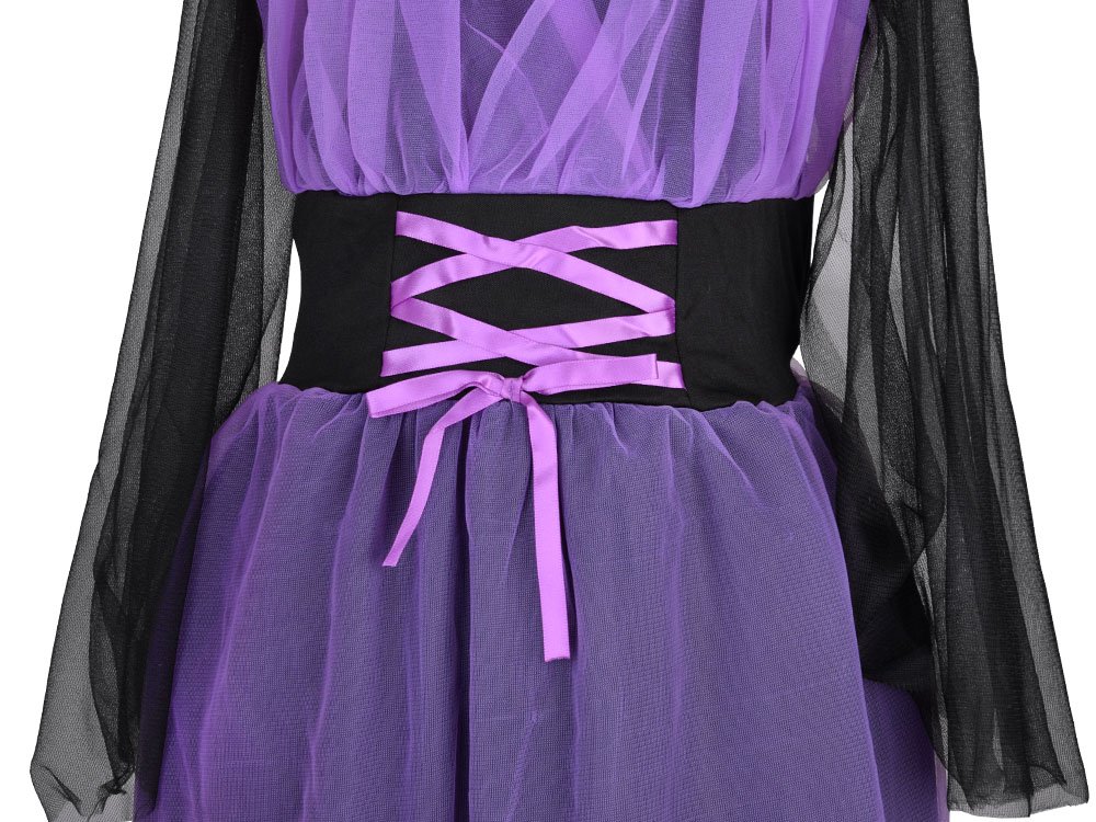 • Haljina je izrađena od elastičnog crnog materijala, sa slojem ljubičastog tila i ukrasnom trakom koja krasi pojas haljine