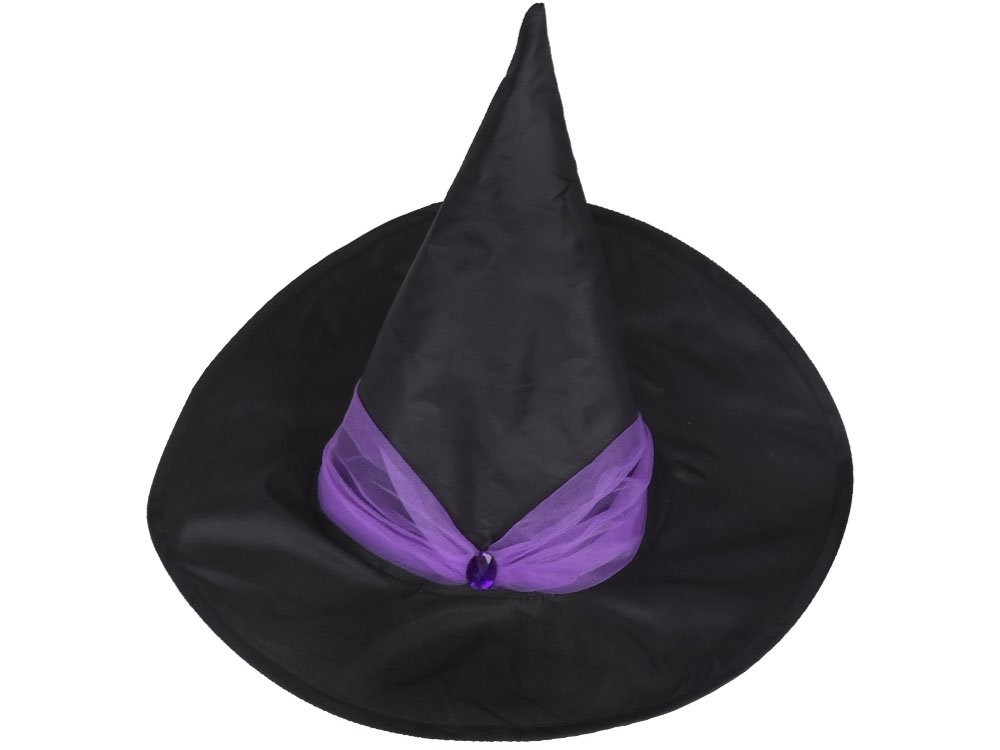 • Crni šiljati šešir s ukrasnim ljubičastim tilom i dijamantom